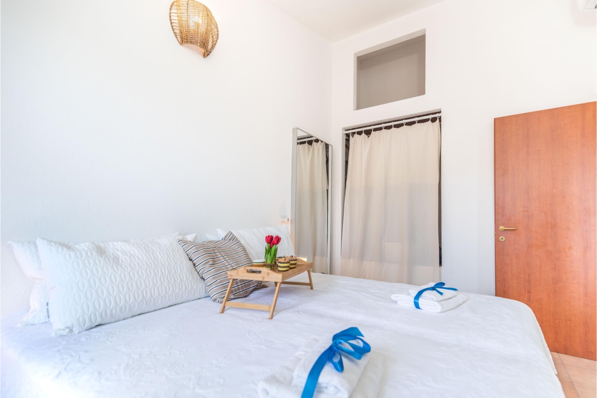 Bedroom 1: The master bedroom enjoys access to the balcony and gorgeous sea view from the picture window at the end of the bed. This room benefits from air conditioning and is furnished with a double bed and a wardrobe