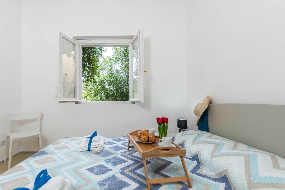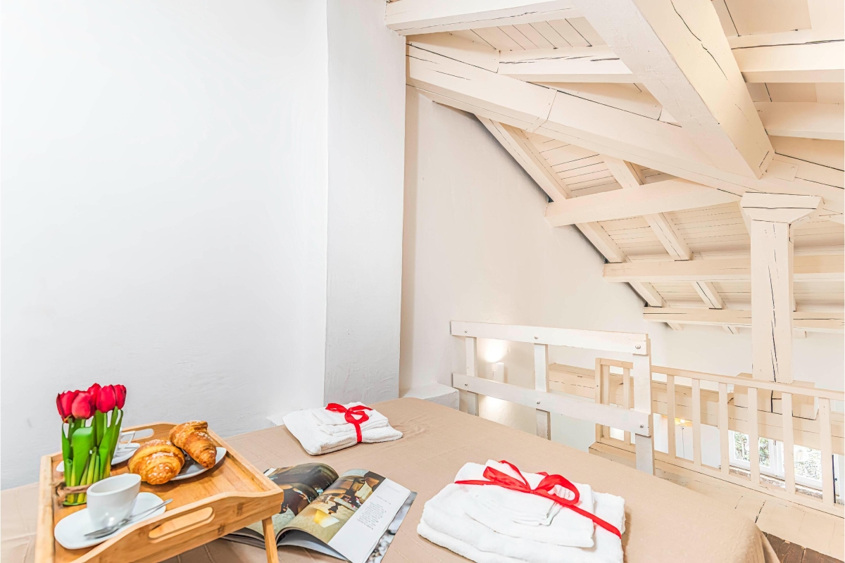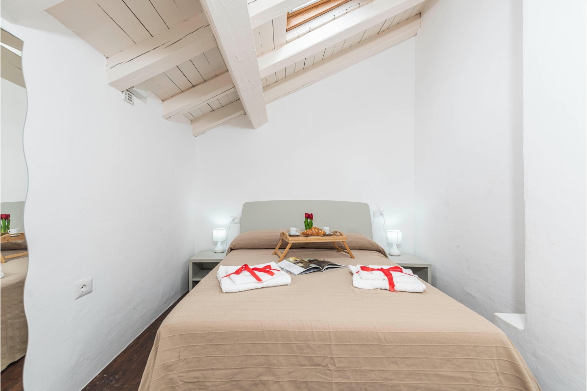 The apartment is light and airy with high ceilings and a spacious open-plan living area, complete with sliding glass doors leading out to a rustic, shaded balcony. Guests can enjoy meals al fresco on the balcony thanks to the dining table for 6. Back indoors there is a sofa, a flat-screen TV, another dining table and a sleek kitchen. The kitchen is equipped with an induction hob, microwave, dishwasher, a Moka coffee maker and fridge/freezer.