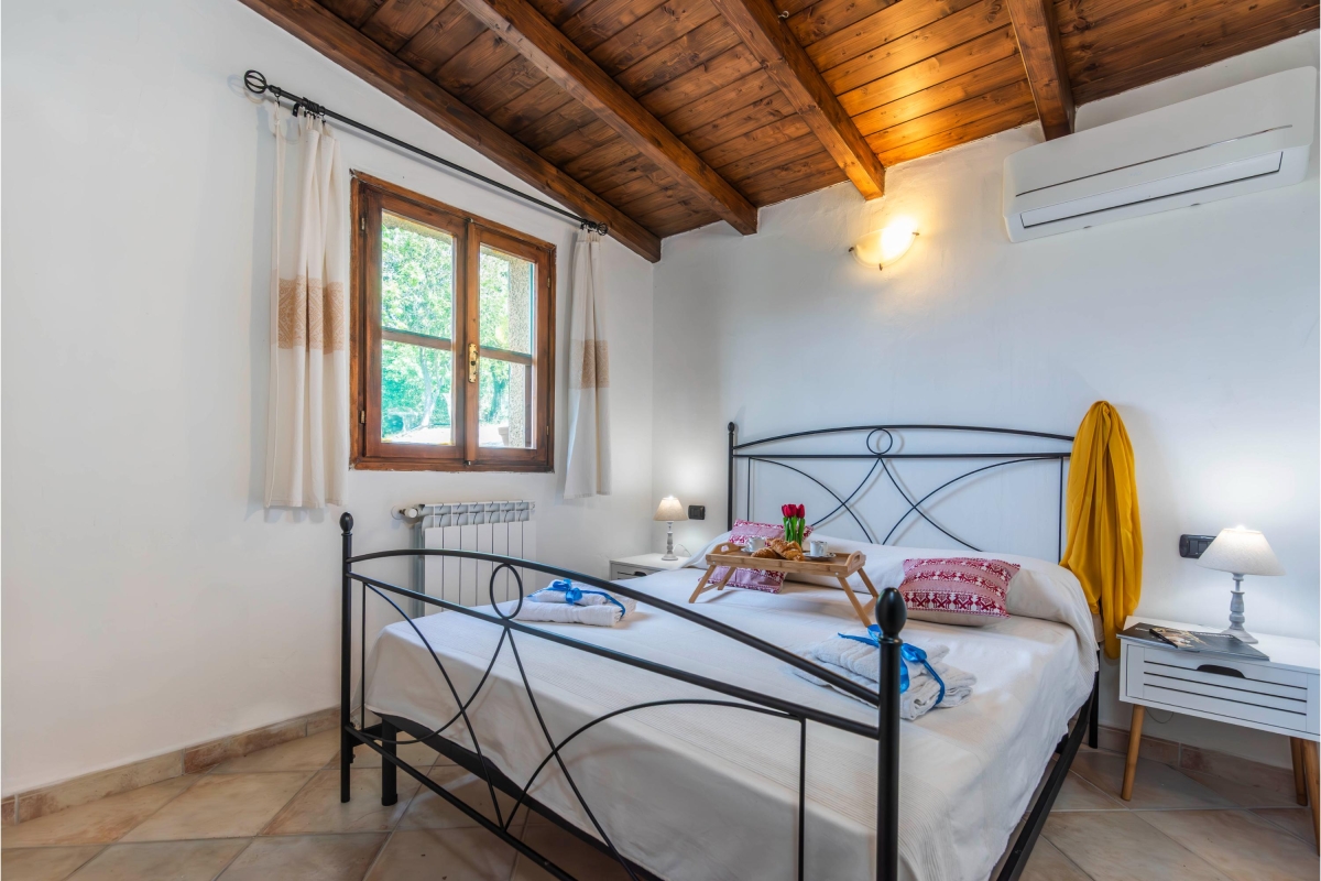 Bedroom 1: Features a double bed, a wardrobe, and an air conditioner.