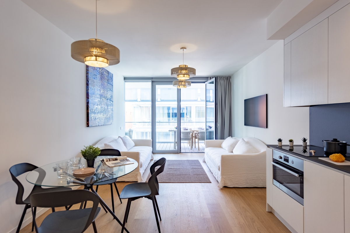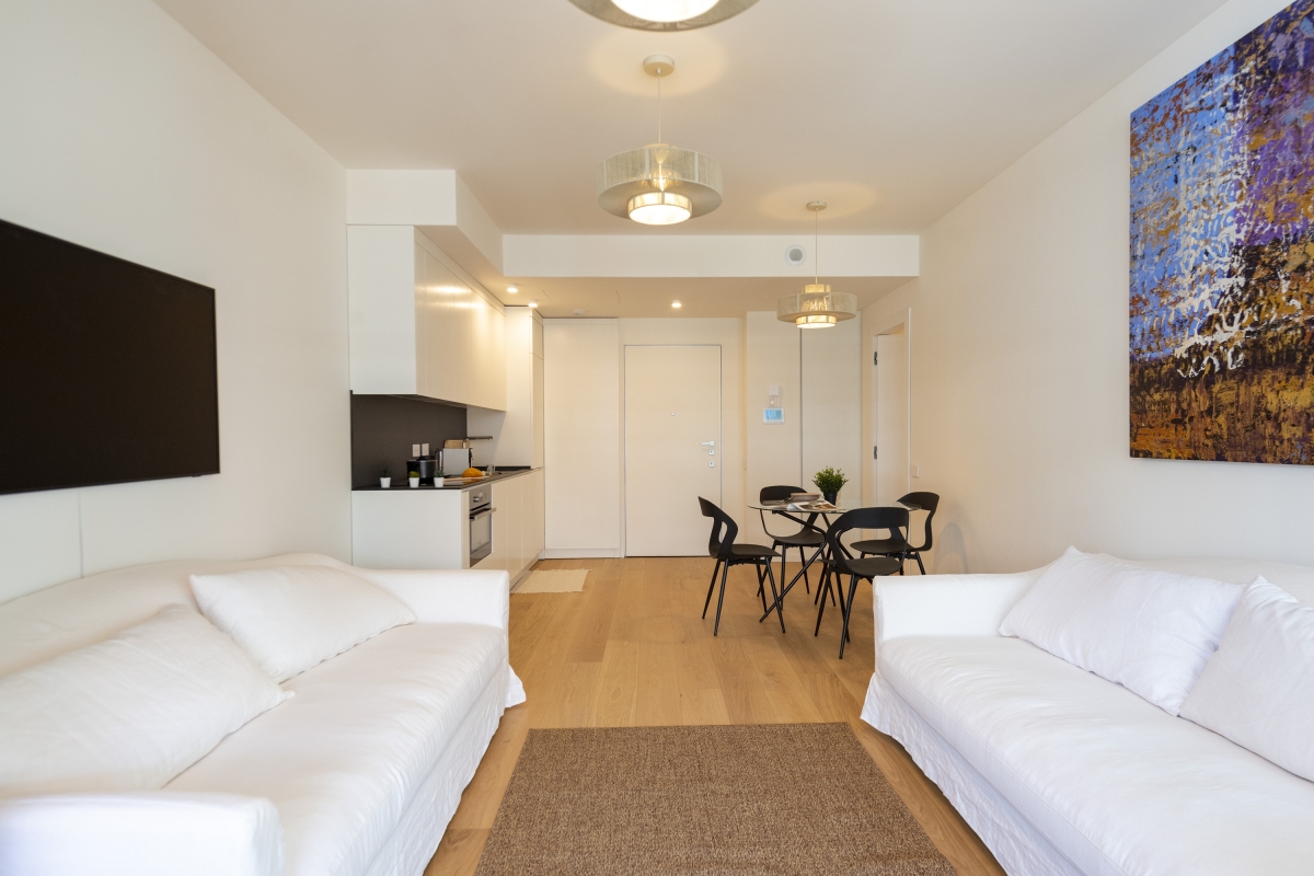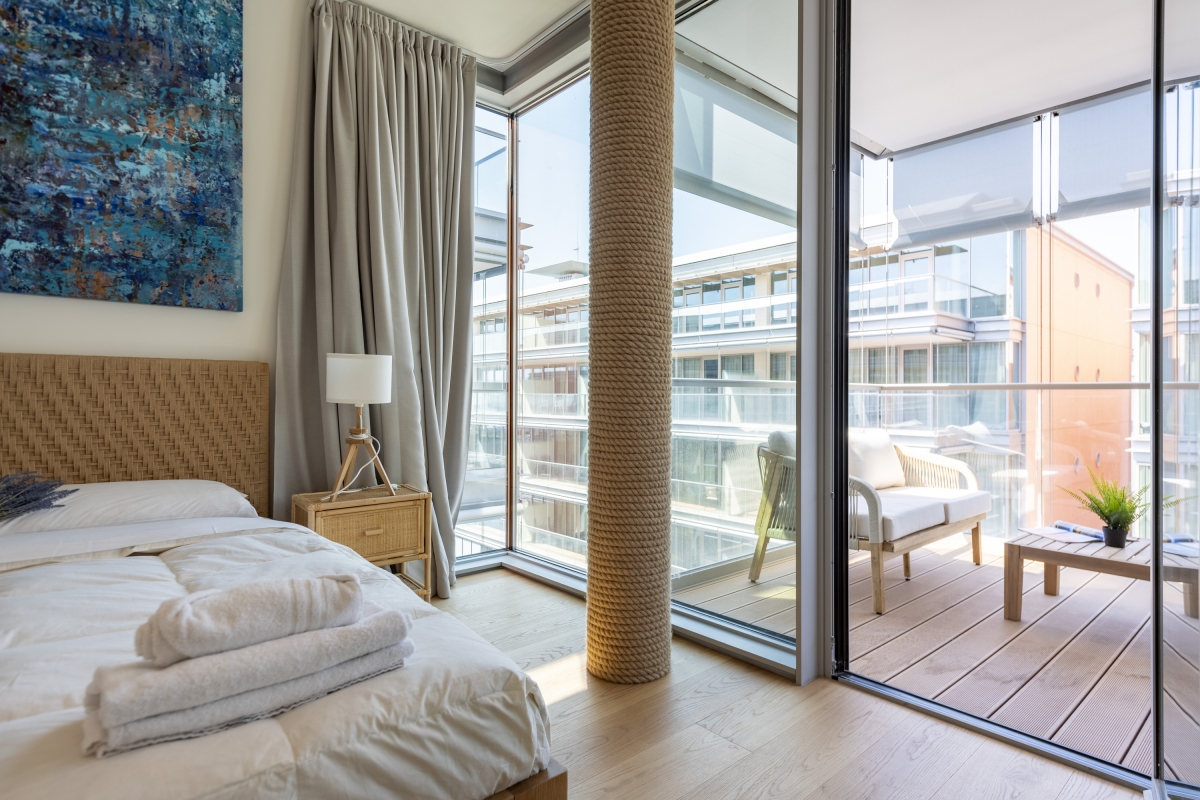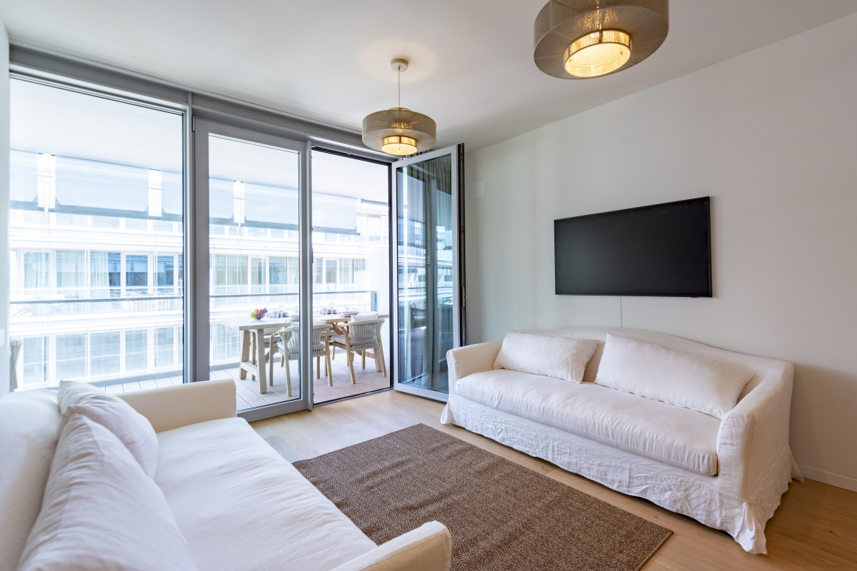 The apartment is beautifully decorated with everything that guests might need for a comfortable stay. The open-plan living area has 2 sofas, a neat dining table for 4 and a sleek, modern kitchen. The kitchen is equipped with an induction hob, oven, dishwasher, microwave, Nespresso coffee machine, dishwasher and fridge/freezer.