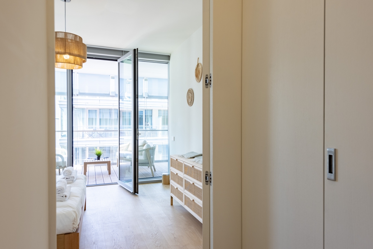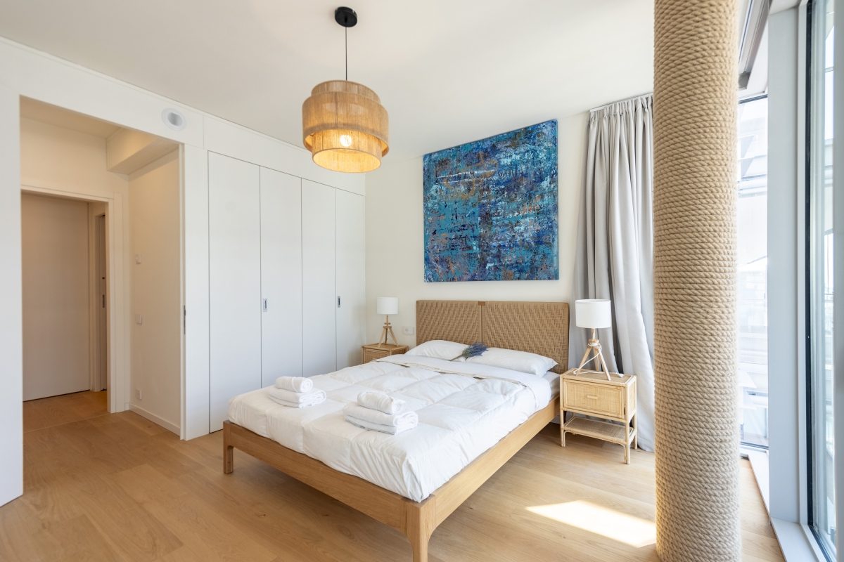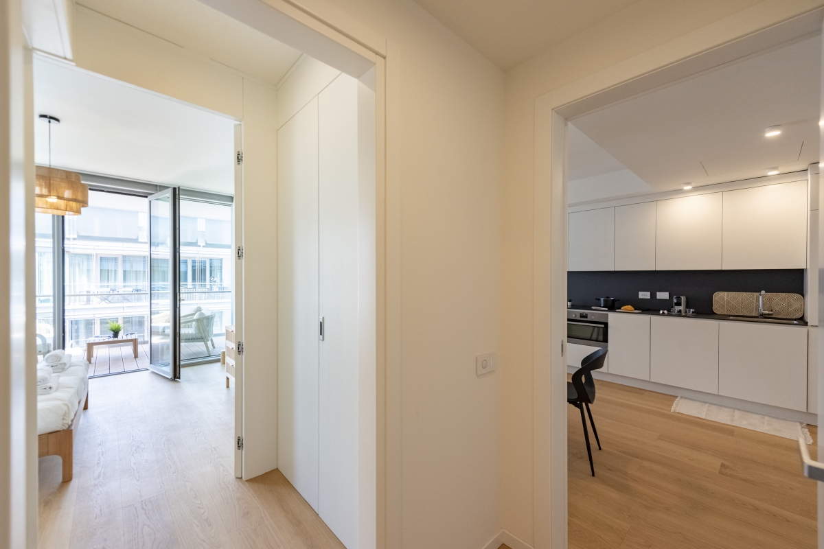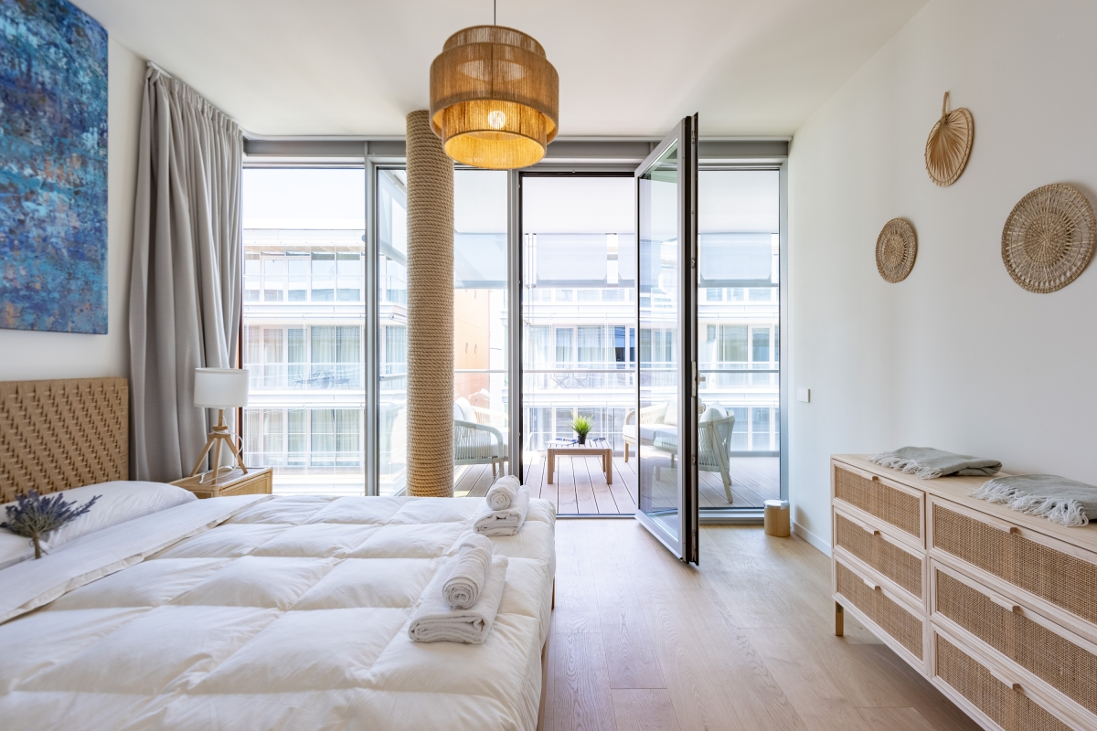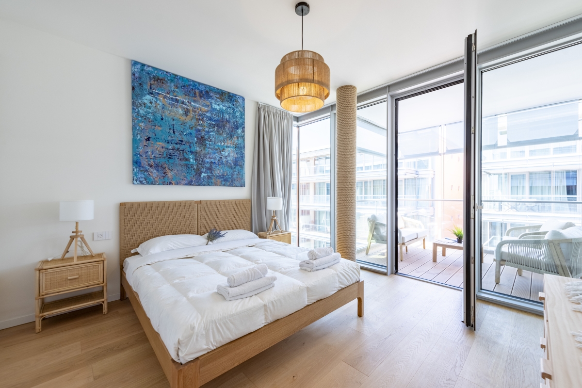 The apartment is beautifully decorated with everything that guests might need for a comfortable stay. The open-plan living area has 2 sofas, a neat dining table for 4 and a sleek, modern kitchen. The kitchen is equipped with an induction hob, oven, dishwasher, microwave, Nespresso coffee machine, dishwasher and fridge/freezer.