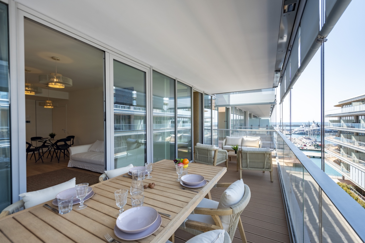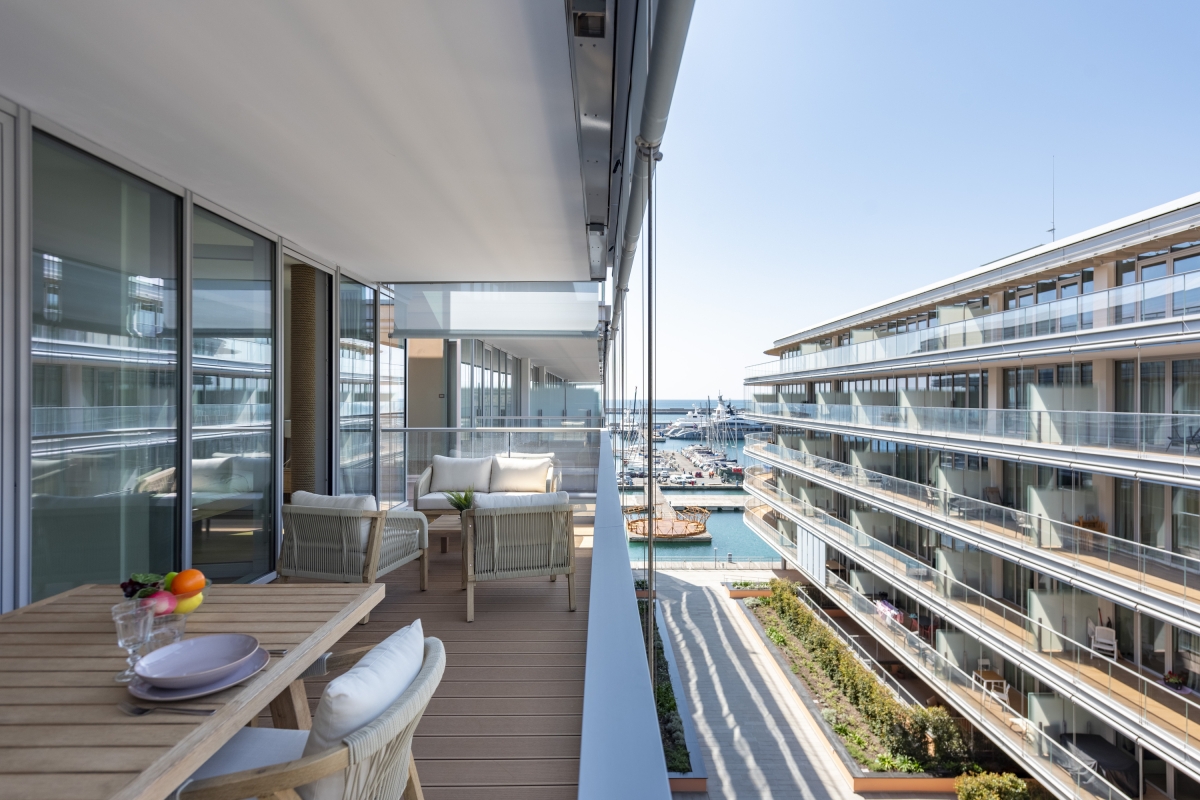 Glass doors lead out from the seating area to the shaded balcony which enjoys a sea view. The balcony is an extension of the living area and is furnished with a dining table and chairs for meals al fresco, as well as a sofa and armchairs for guests to relax with a glass of wine or a book.