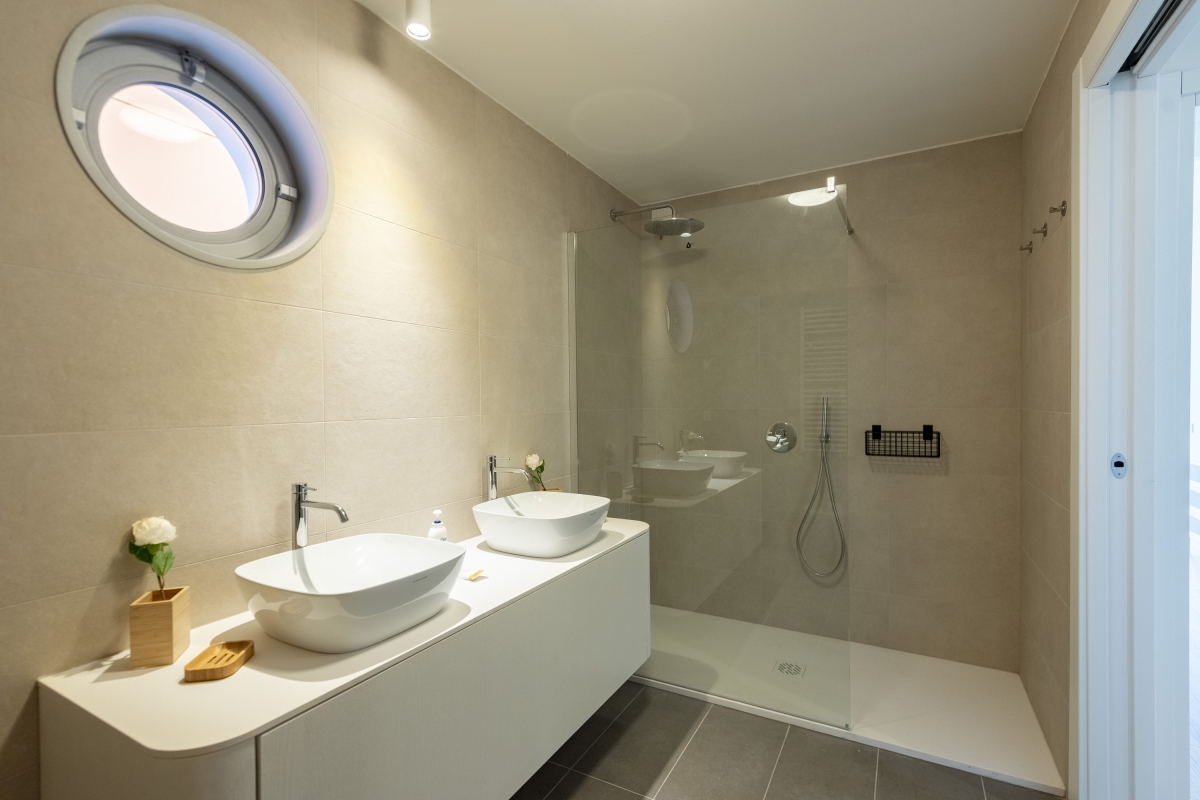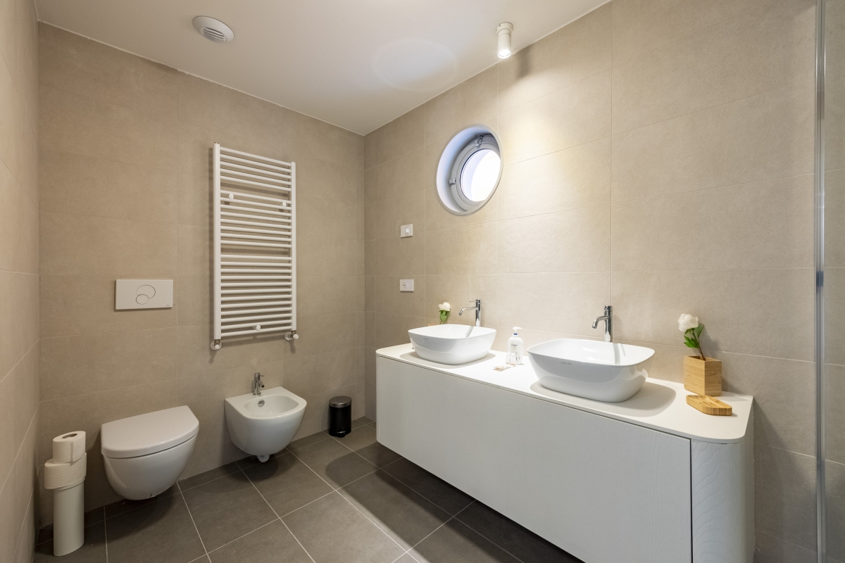 The luxurious bathroom is appointed with a walk-in glass shower, double basins, bidet and WC.