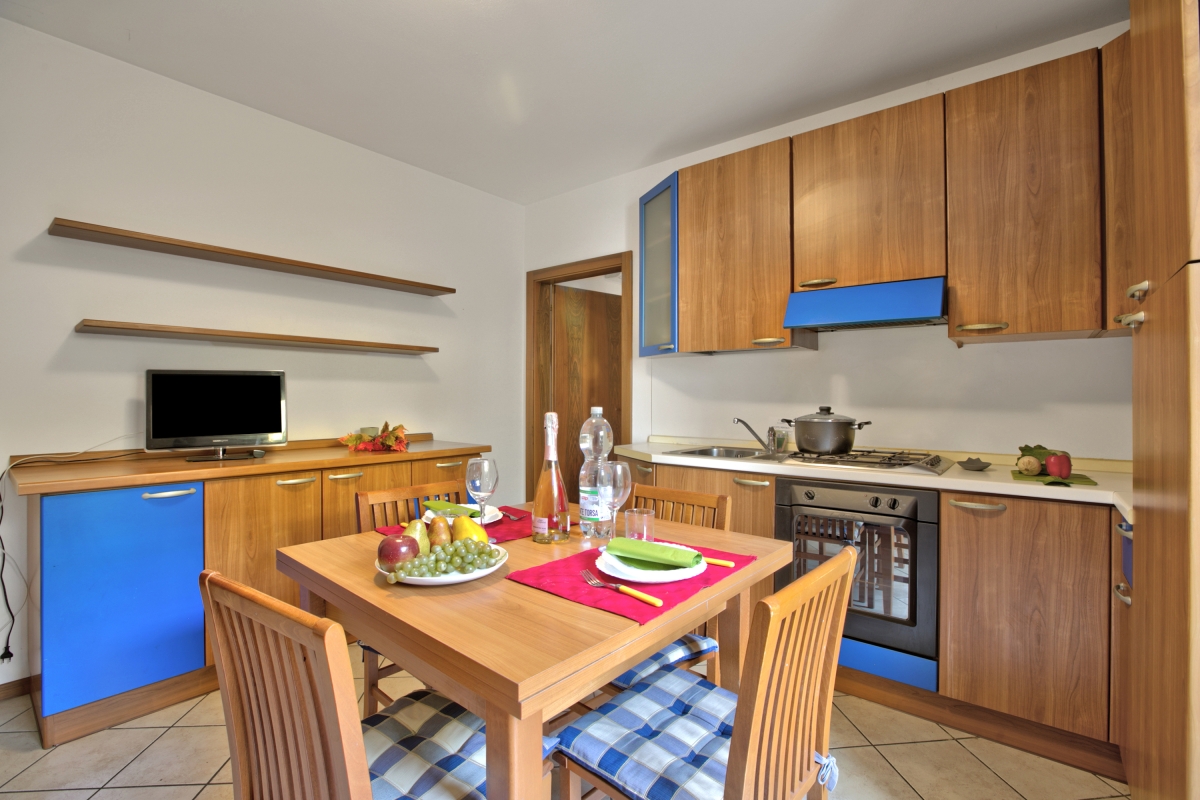 The property enjoys a spacious open plan living space that incorporates the kitchen and is furnished with a comfortable sofa, a dining table and a TV. The kitchen is equipped with a Moka coffee machine, a cooker hob, an oven, a microwave and a fridge.