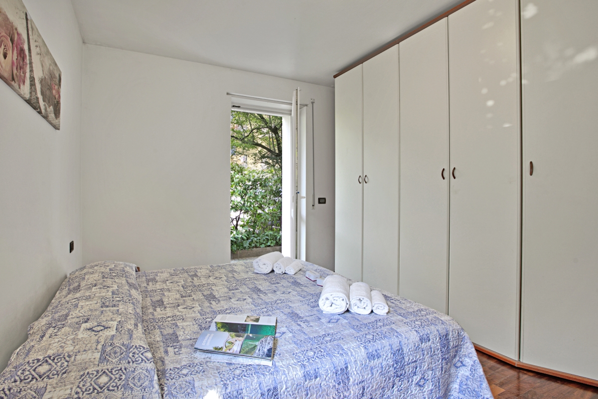 Bedroom 1: The bedroom is furnished with a double bed, a large wardrobe and a chest of drawers.