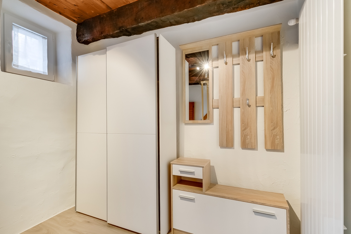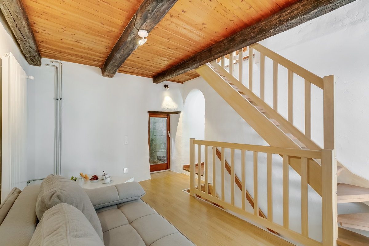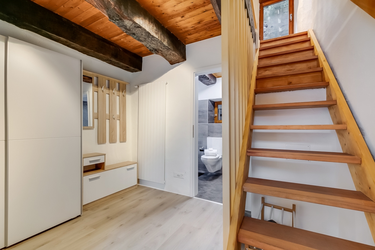 Step inside and you’ll be welcomed by a warm entrance hall with a handy wardrobe and a stylish bathroom with a shower. Upstairs, the first floor features a cosy lounge area with a sofa, and a bright, modern kitchen with an induction hob, oven, fridge with freezer, and a dining table. A small balcony lets you enjoy views of the stone-lined alley. The top floor offers a peaceful sleeping area with one double bed and a single bed, ideal for rest after a day of exploring.