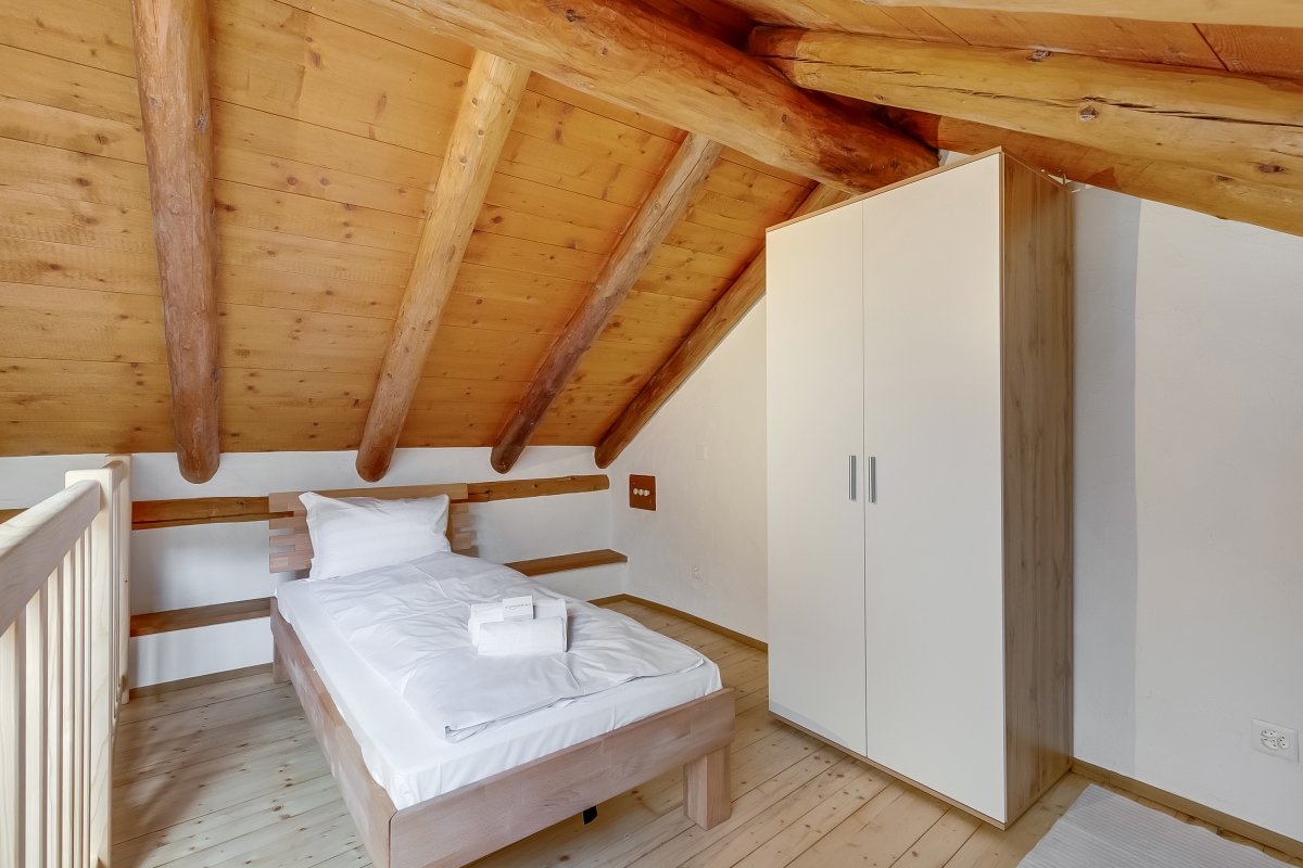 Bedroom 1: The bedroom has a double bed, a single bed, and a wardrobe.