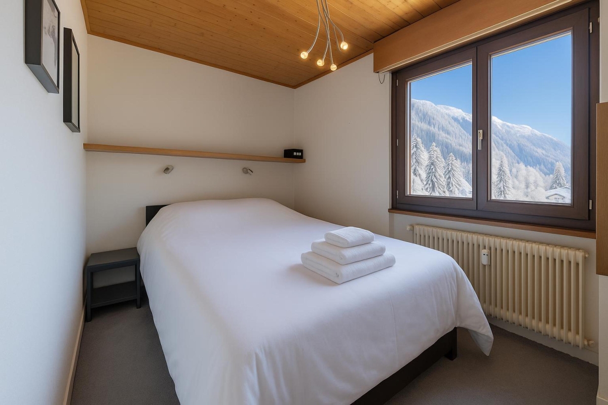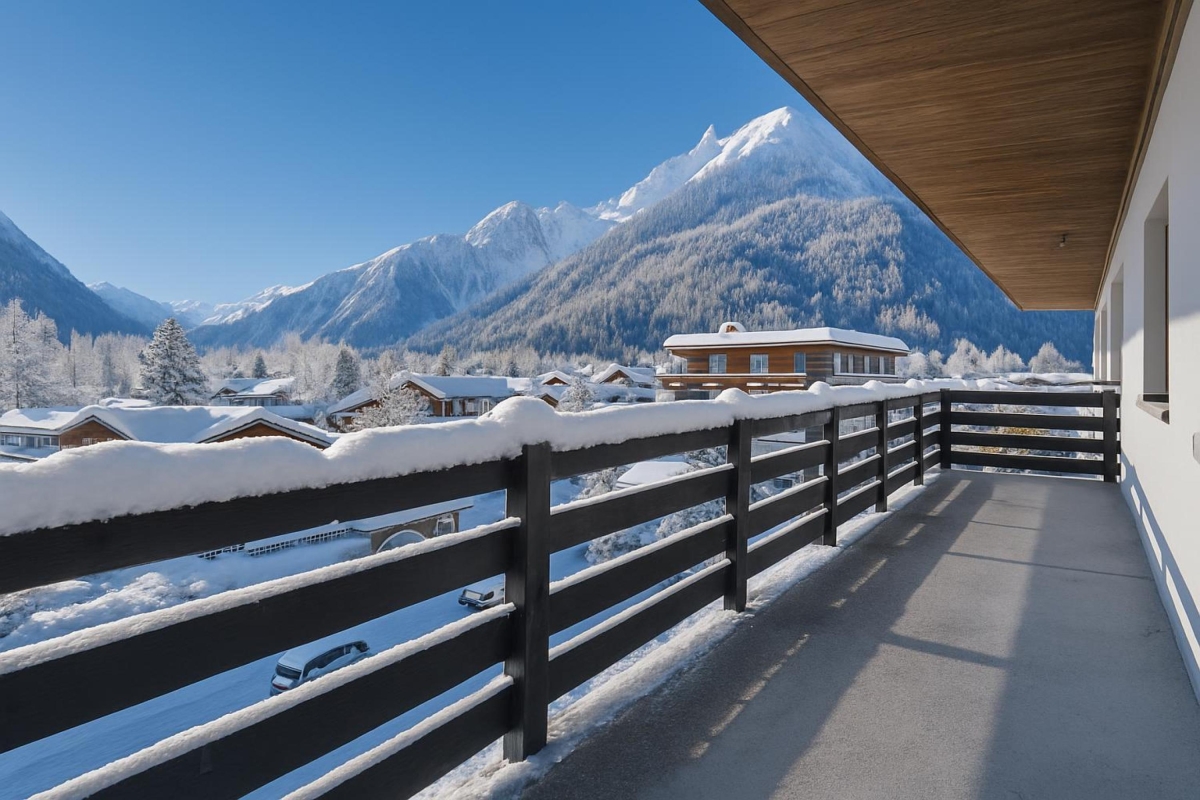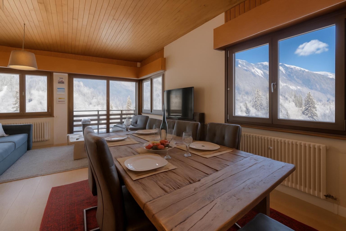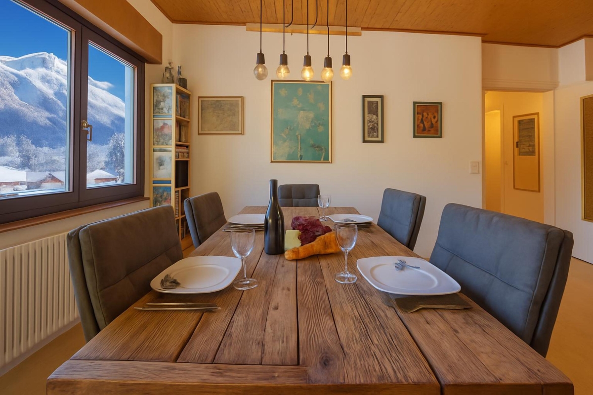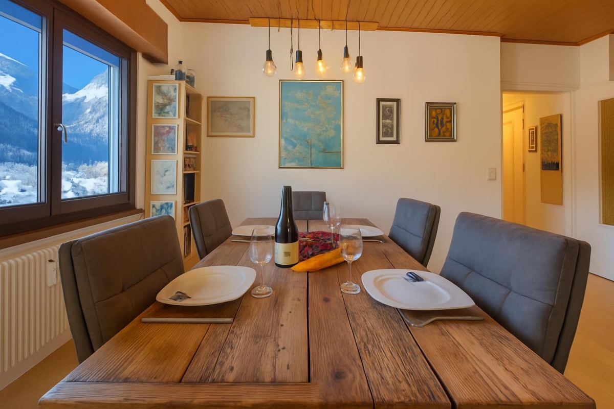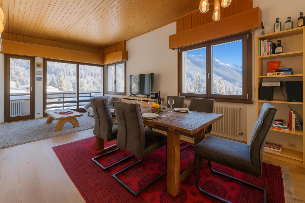 This contemporary and stylishly furnished apartment is located on the 5th floor of a quiet residence with convenient lift access. The property features a spacious, sunlit living room with comfortable sofas, a flat-screen TV, a bookshelf for quiet reading moments, and a dining table perfectly positioned to enjoy the stunning mountain views. Large glass doors lead out to a private balcony, inviting guests to relax and fully immerse themselves in the serene alpine surroundings.