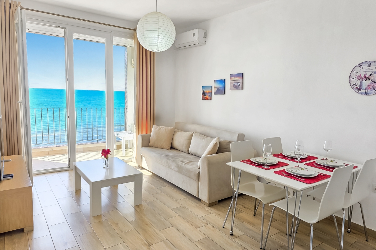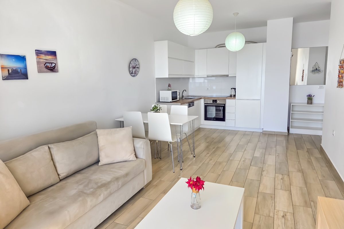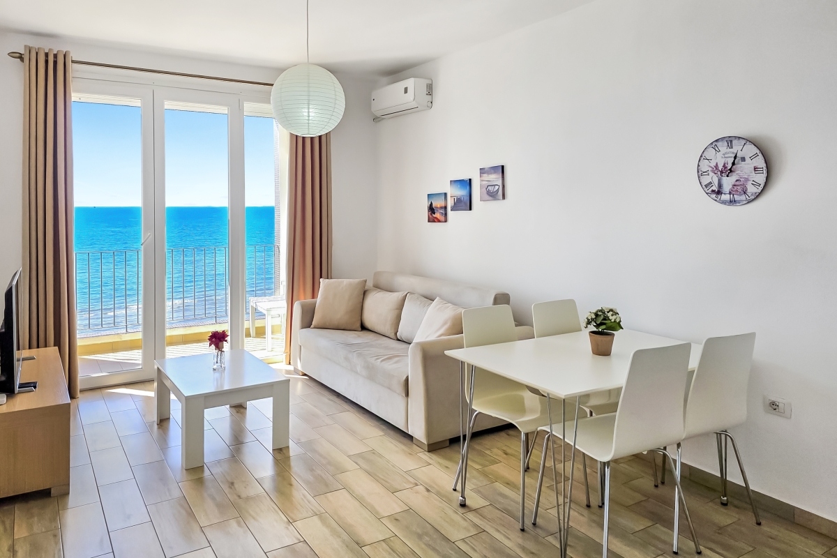 The open-plan living area is furnished with a sofa, flat-screen TV and a dining table for 4. The new, corner kitchen is fully equipped with a cooker hob, oven, microwave, dishwasher and a fridge/freezer. The room has glass doors that lead out to the private balcony where guests can enjoy the panoramic sea views.