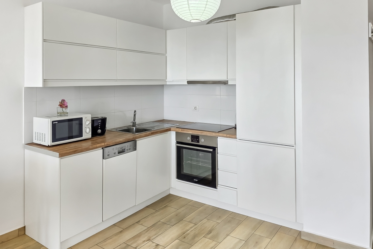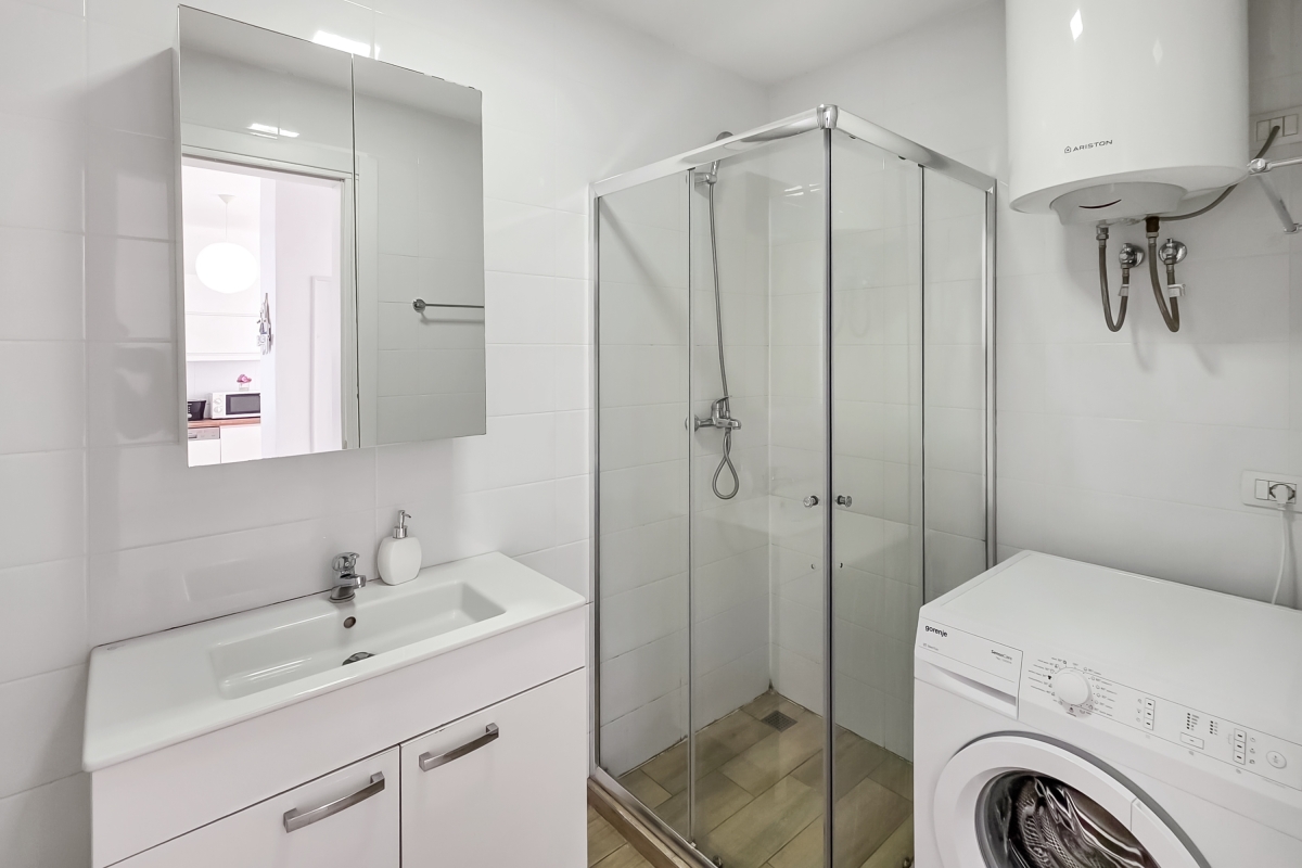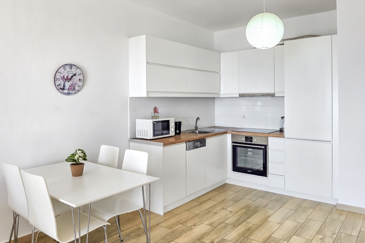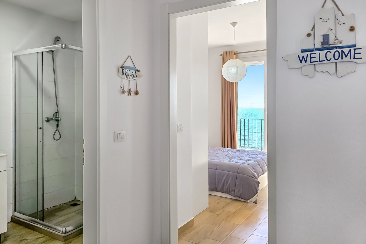 The open-plan living area is furnished with a sofa, flat-screen TV and a dining table for 4. The new, corner kitchen is fully equipped with a cooker hob, oven, microwave, dishwasher and a fridge/freezer. The room has glass doors that lead out to the private balcony where guests can enjoy the panoramic sea views.