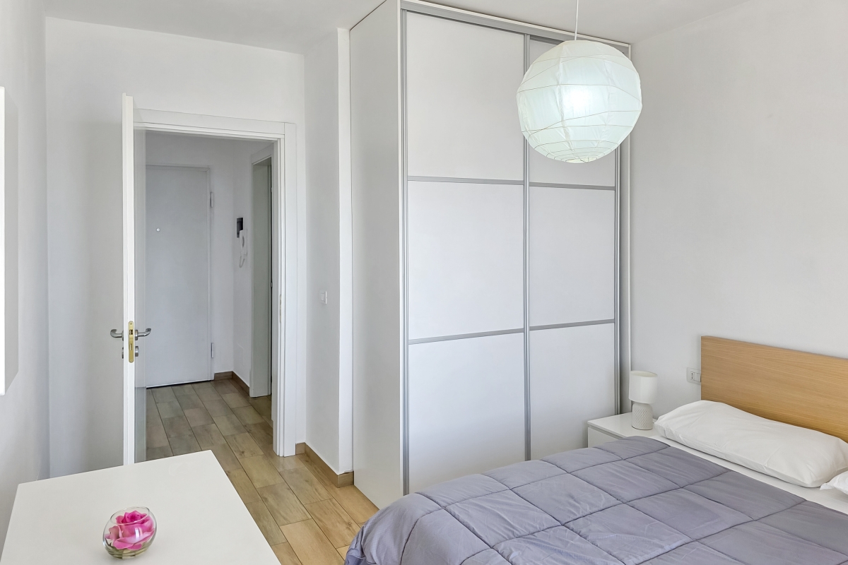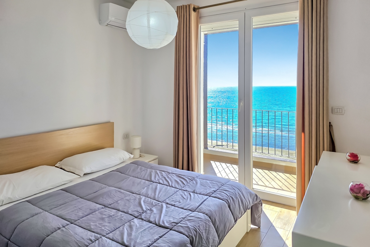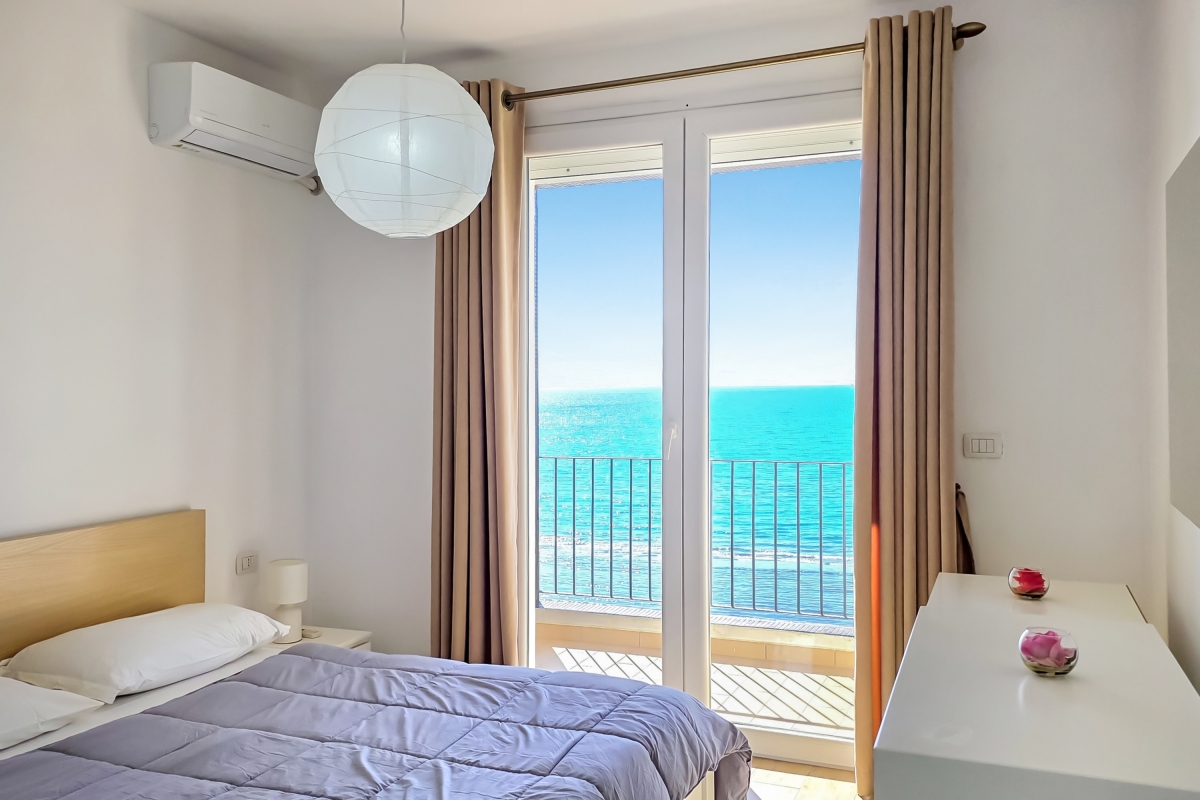 The master bedroom is full of light, thanks to the glass doors that lead out to another balcony overlooking the sea. It is furnished with a king-sized double bed, wardrobe and a laptop-friendly workspace.