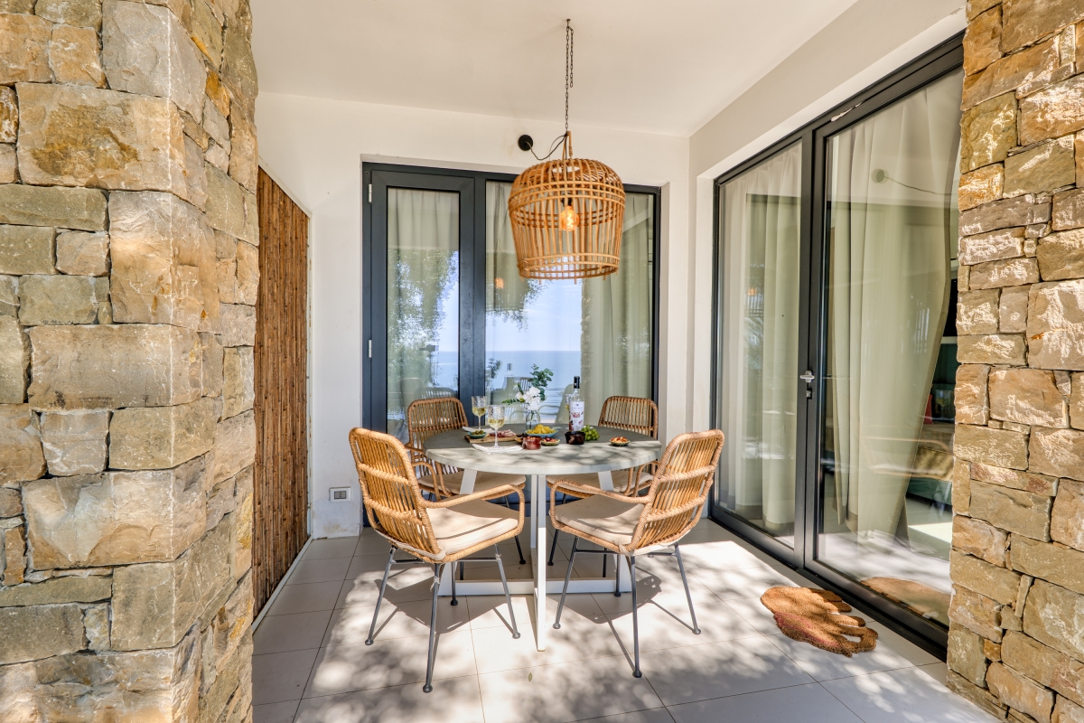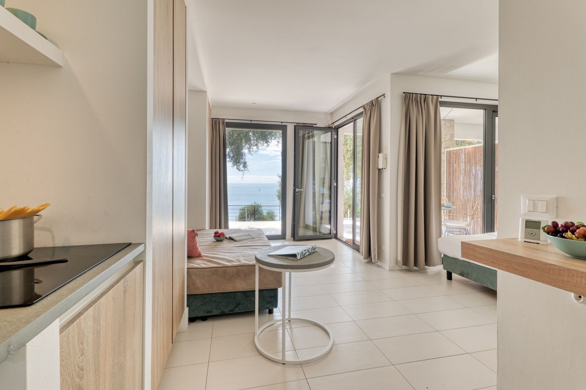 The open-plan living area with a single sofa has access to the terrace with sweeping 180° sea views, perfect for dining al fresco. The modern kitchen is equipped with a coffee machine, electric kettle, fridge, and induction hob, perfect for preparing meals.