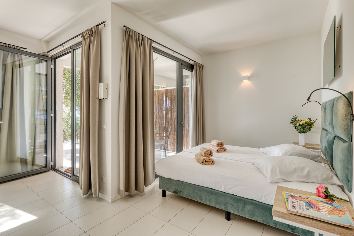 Bedroom 1: The air-conditioned bedroom has a comfortable double bed and access to a private terrace offering picturesque views.