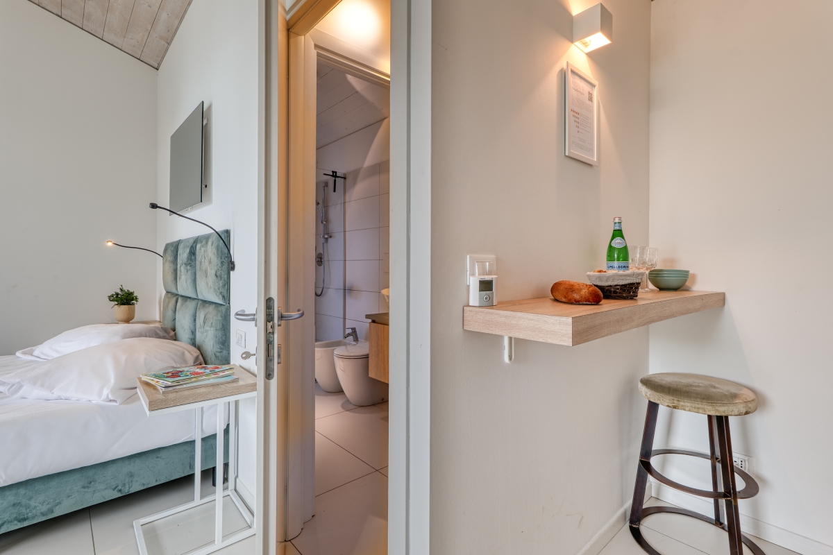 Bedroom: The bedroom features a comfortable double bed, a wardrobe, a terrace, and air conditioning.