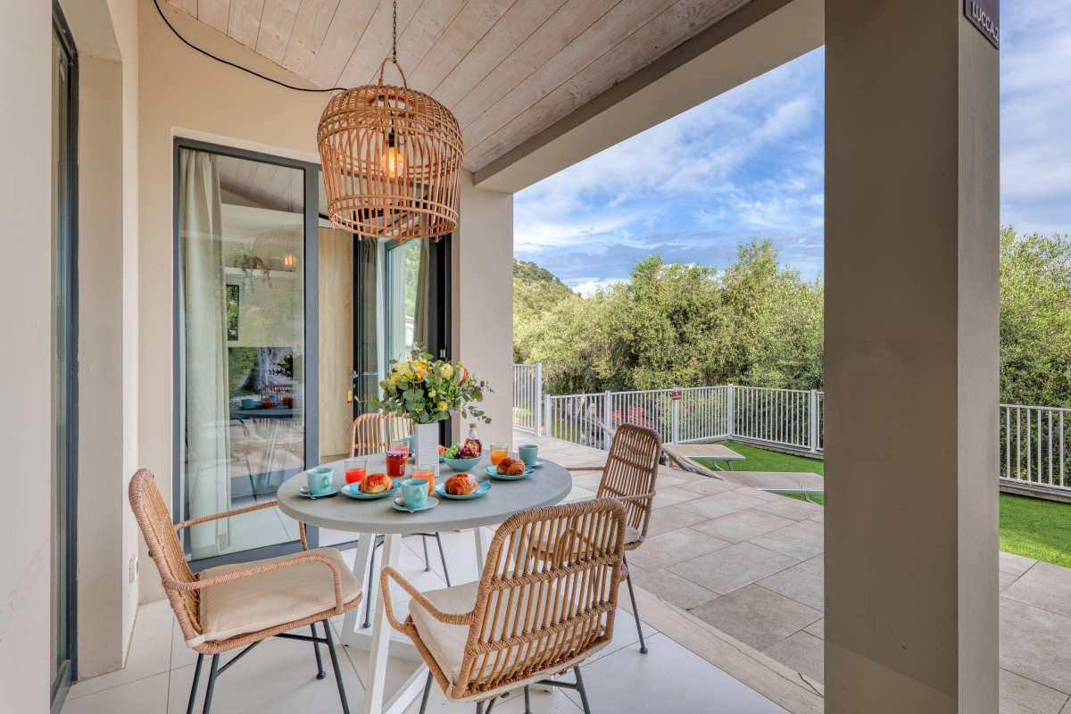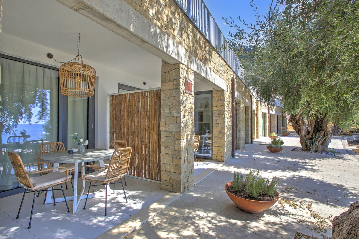 Designed for couples or solo travellers, this modern retreat offers a bright open-plan living space with a single sofa and access to the terrace with sweeping 180° sea views, perfect for dining al fresco. The open kitchen is equipped with a coffee machine, electric kettle, fridge, and induction hob, providing all the essentials for your culinary adventures.