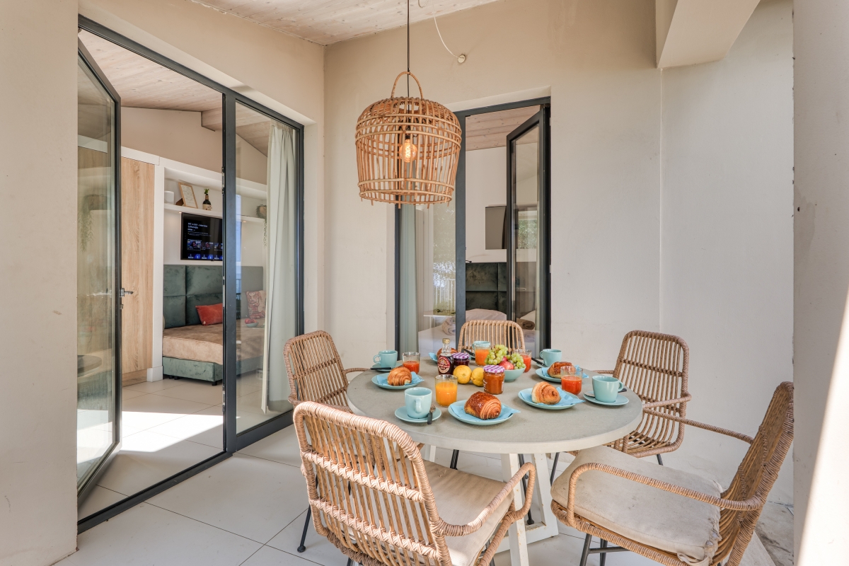 The living room is bright and airy, featuring a comfortable double sofa bed and large windows that open onto the terrace with stunning sea views. It offers a cosy, modern space perfect for relaxing or socialising. The open kitchen is designed for convenience and includes a coffee machine, electric kettle, and fridge, complemented by an induction hob. The dining area is separate, providing a cosy space for meals. Modern amenities such as Free Wi-Fi and a Smart TV ensure a comfortable stay.