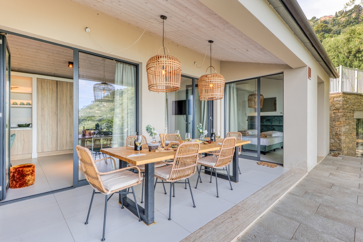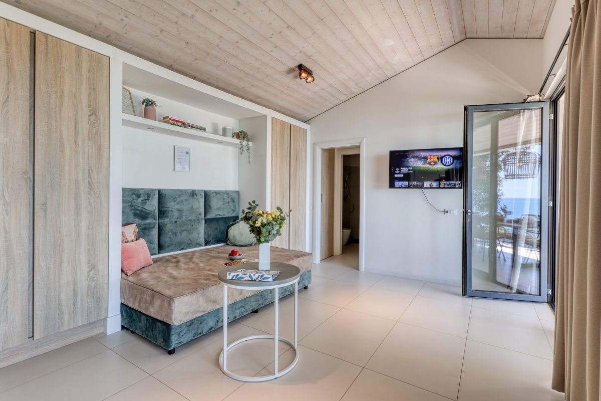 Enjoy leisurely meals in the open-plan living area with a single sofa and access to the terrace with sweeping 180° sea views, perfect for dining al fresco. The modern kitchen is equipped with a coffee machine, electric kettle, fridge, induction hob, and an open kitchenette, perfect for preparing meals.