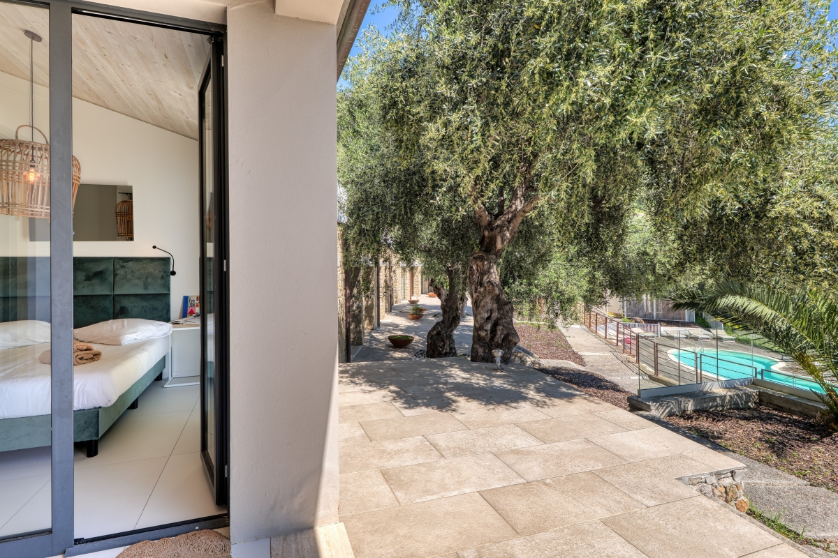 Bedroom 1: Features a double bed, a wardrobe, air conditioning, and access to a terrace.