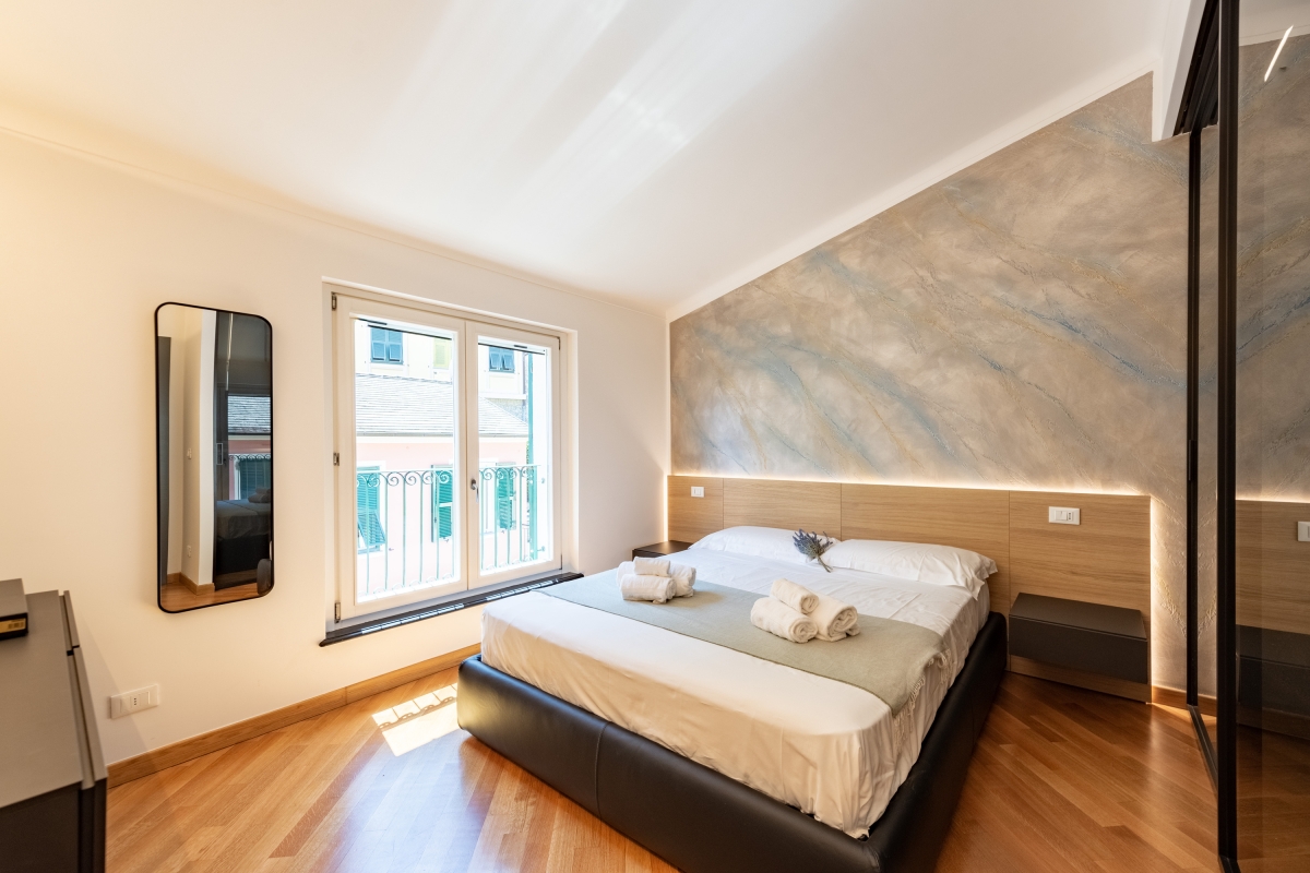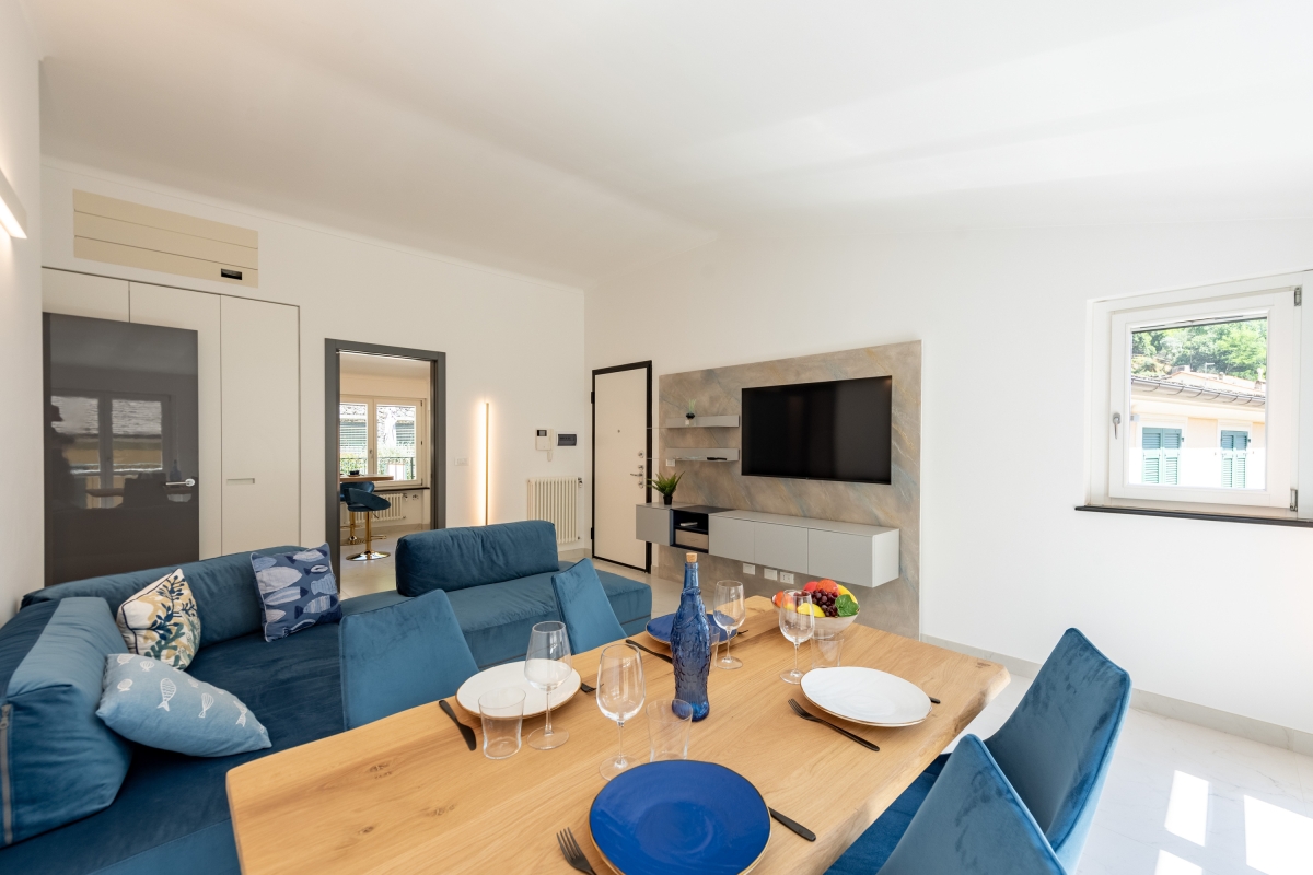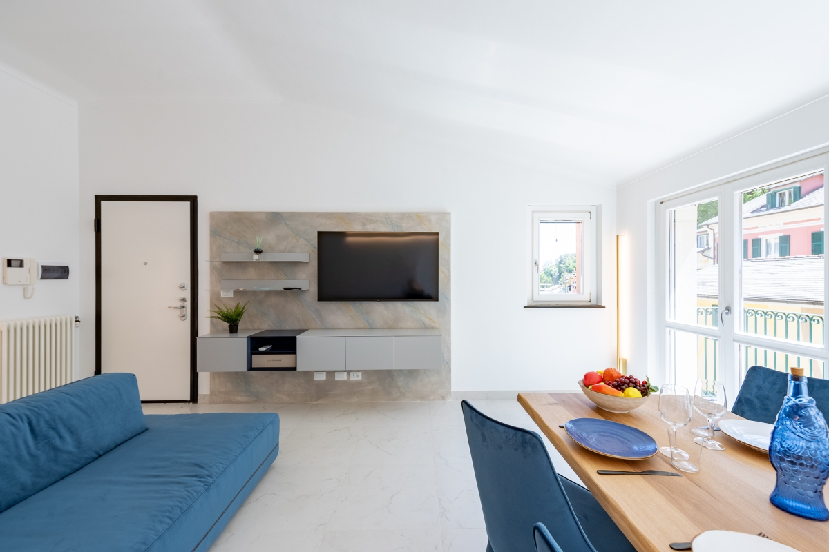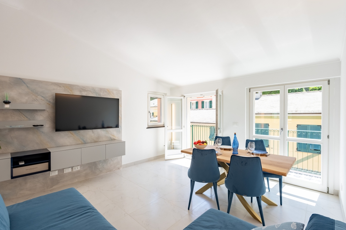 This is a beautifully appointed 1st-floor apartment that offers both comfort and convenience in one of Italy’s most iconic coastal villages. Accessible via a lift-elevator, this two-bedroom retreat comfortably accommodates up to 5 guests and is ideal for families with children or groups seeking a stylish and serene stay. The sunlit living area is bright and inviting, with large glass doors that open onto a private balcony. Inside, you'll find plush sofas, a large flat-screen TV, and an elegantly set dining table perfect for shared meals or relaxed evenings.