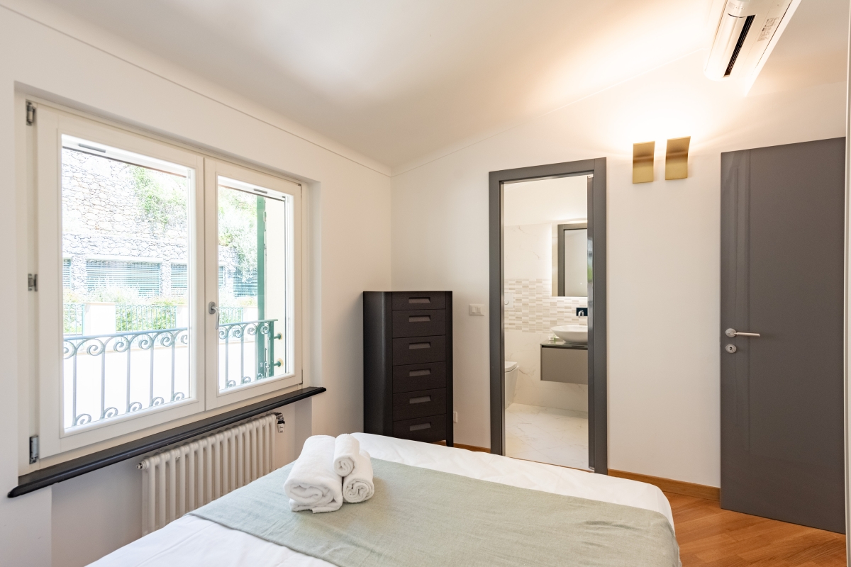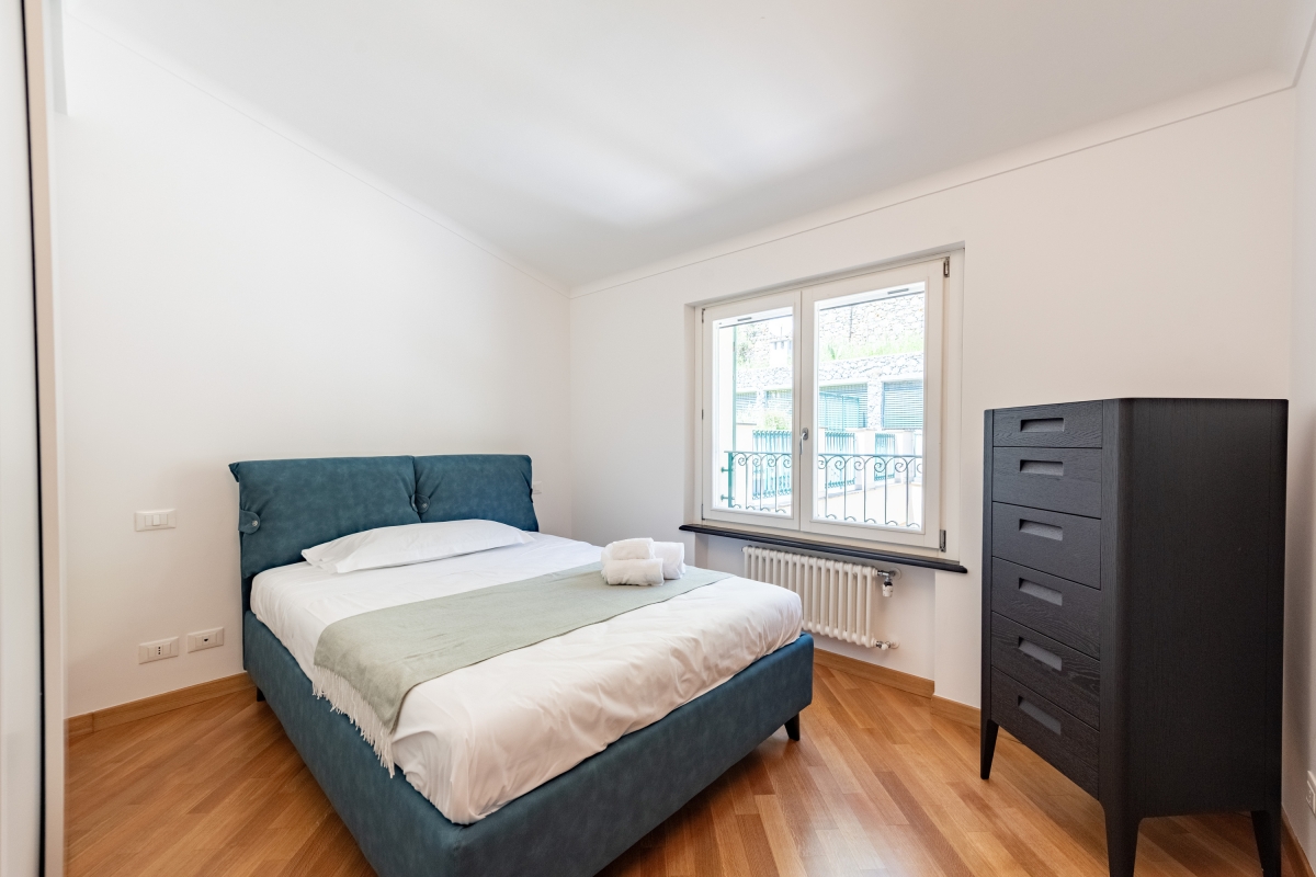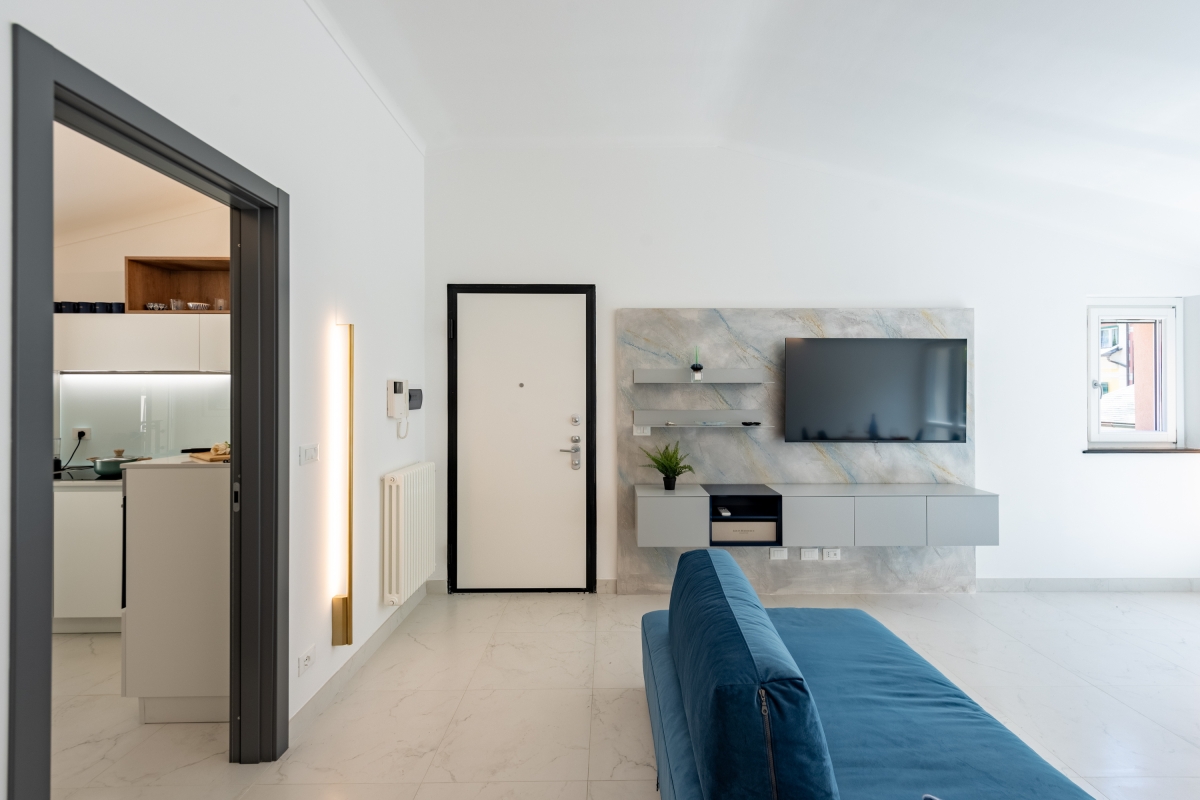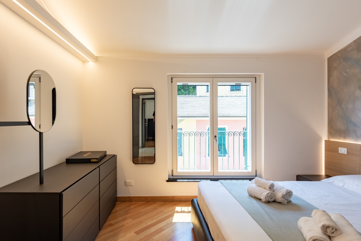 This is a beautifully appointed 1st-floor apartment that offers both comfort and convenience in one of Italy’s most iconic coastal villages. Accessible via a lift-elevator, this two-bedroom retreat comfortably accommodates up to 5 guests and is ideal for families with children or groups seeking a stylish and serene stay. The sunlit living area is bright and inviting, with large glass doors that open onto a private balcony. Inside, you'll find plush sofas, a large flat-screen TV, and an elegantly set dining table perfect for shared meals or relaxed evenings.