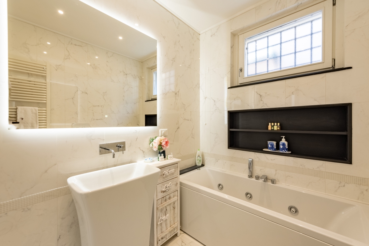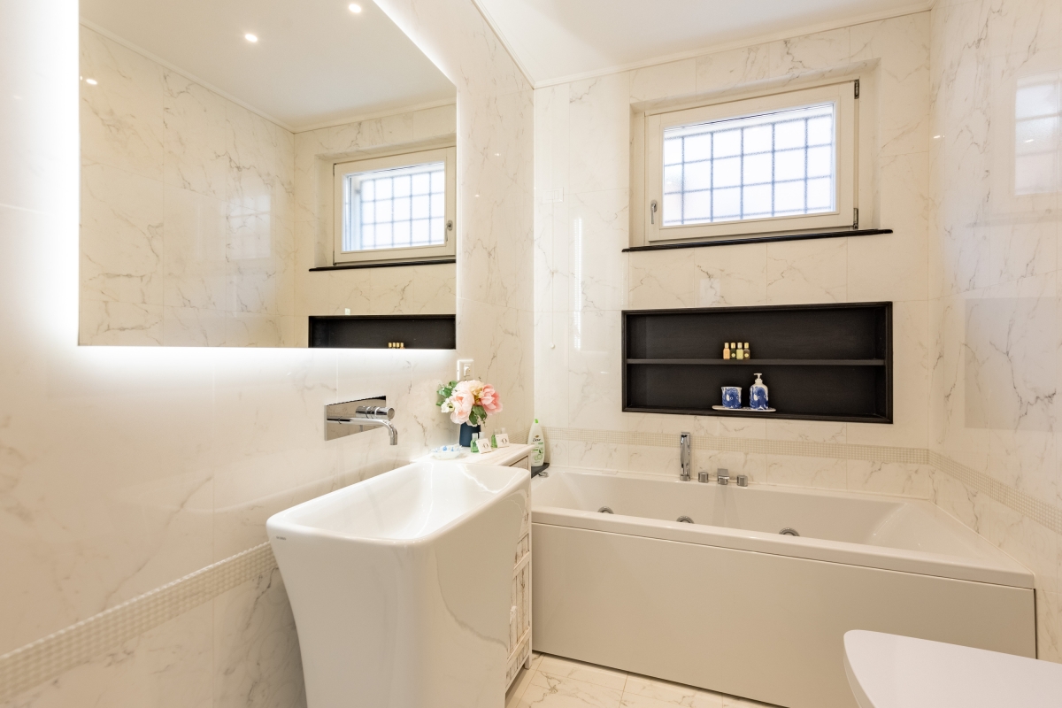 Bathroom 2: This bathroom has a bathtub with a shower, a wash basin and a WC.