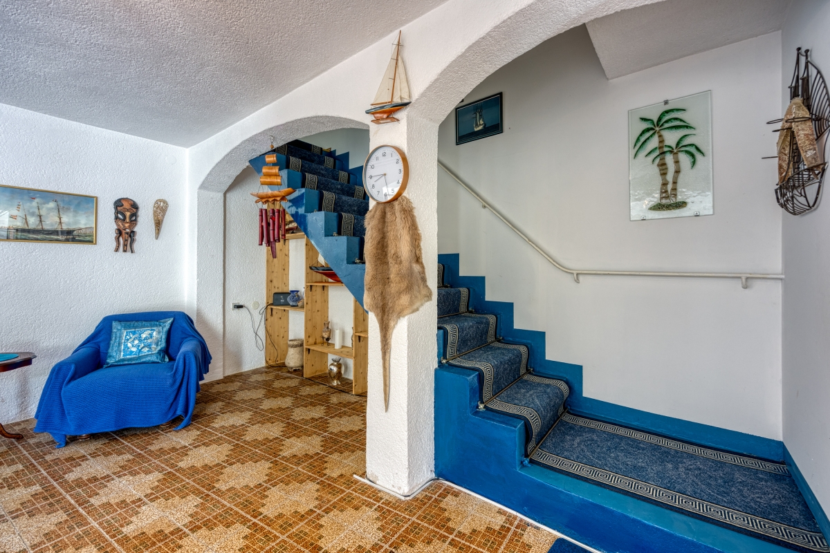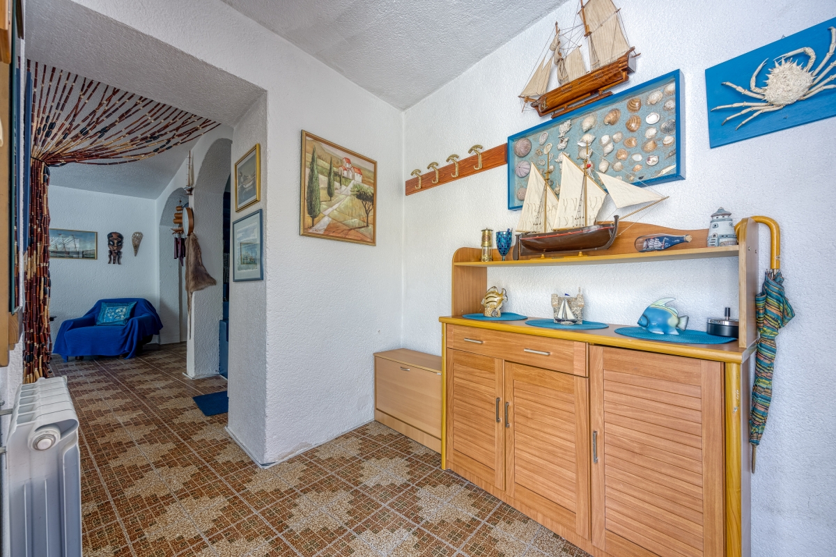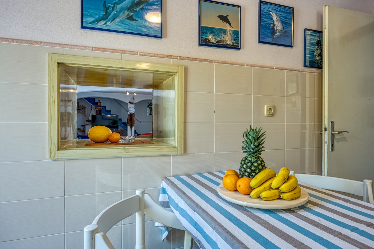 The front door and two French windows lead from the courtyard into the open-plan living area that is furnished with two sofas, a flat-screen TV and a dining table for 8. A hatch connects the kitchen to the dining area. The kitchen is equipped with a cooker hob, oven and a fridge/freezer.