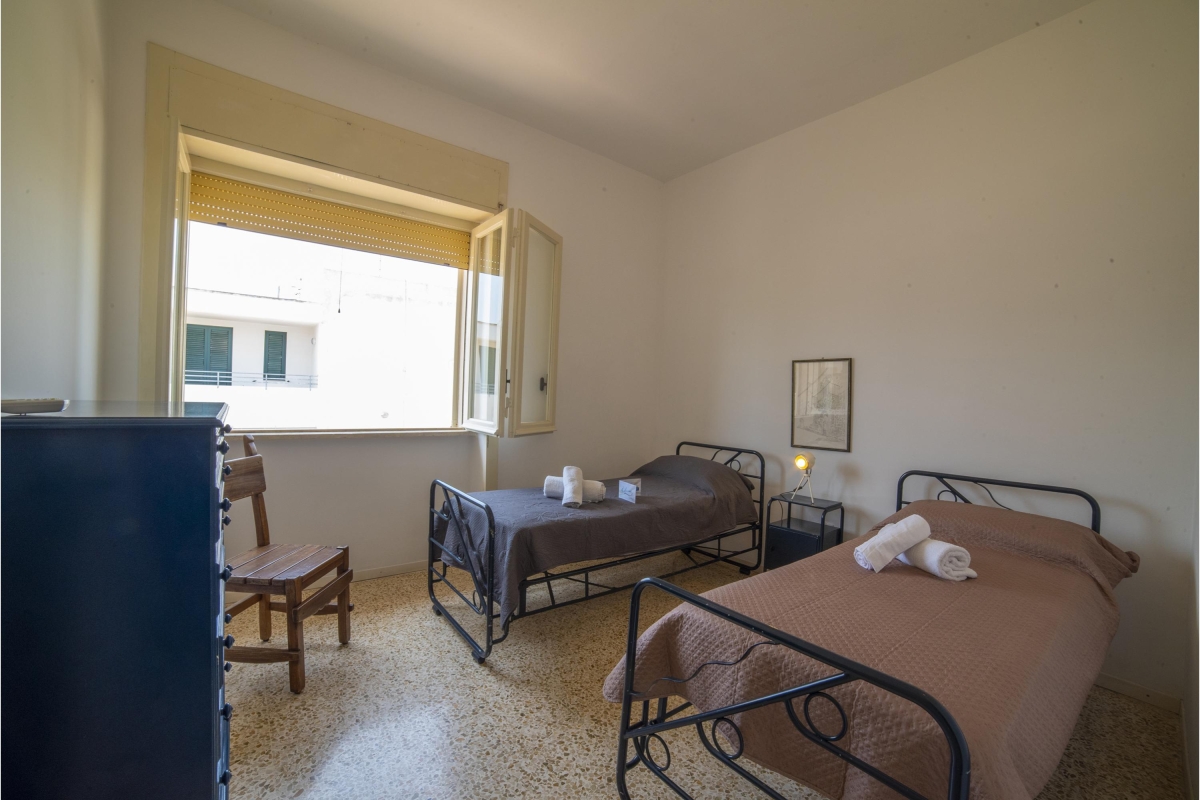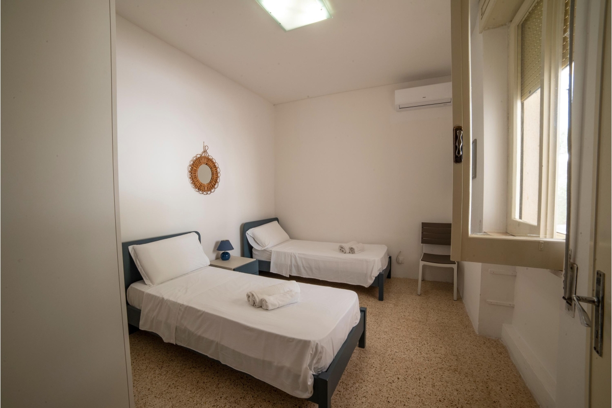 Bedroom 5: This bedroom features two single beds, a wardrobe, and an air conditioner.