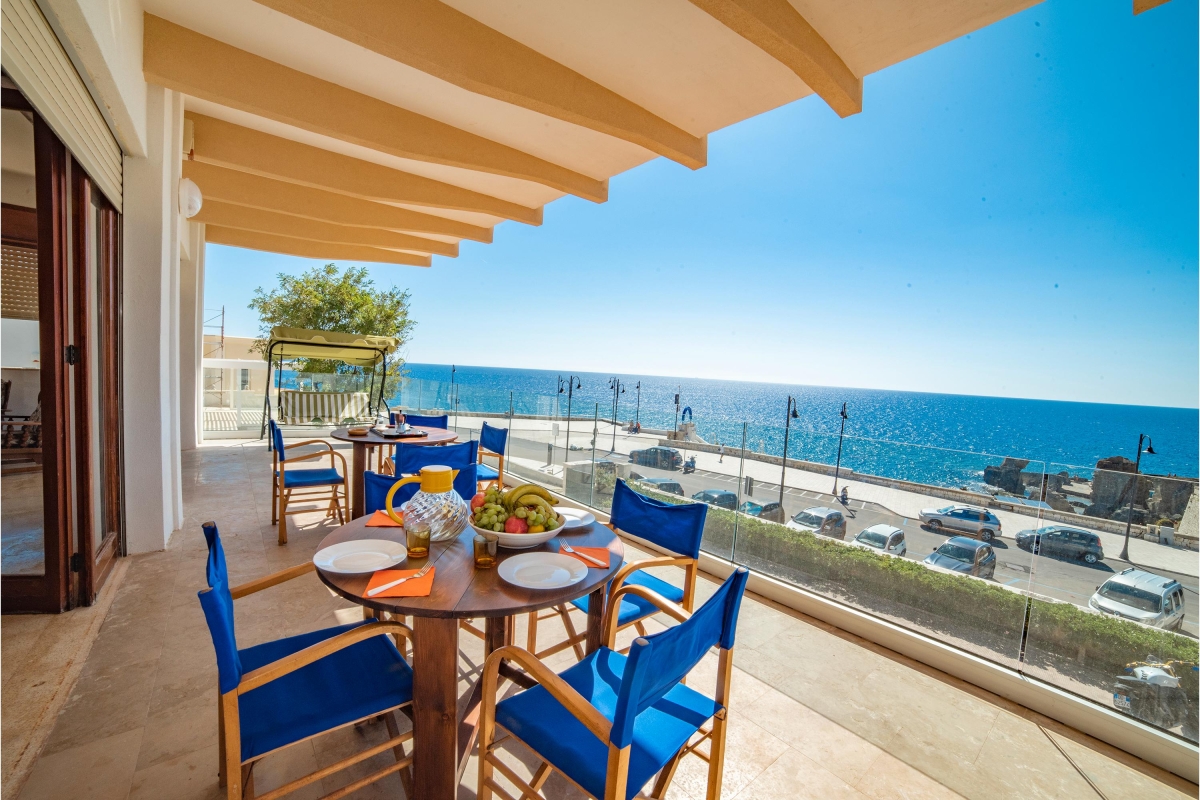 This is an exquisite villa, accommodating up to 11 guests, perfect for families and groups seeking a relaxing seaside escape with panoramic views. The spacious interior features a living room, designed for comfort and relaxation, with a seating area and direct access to a private balcony with picturesque sea views. The well-equipped full kitchen features a coffee machine, oven, cooker hob, and fridge.