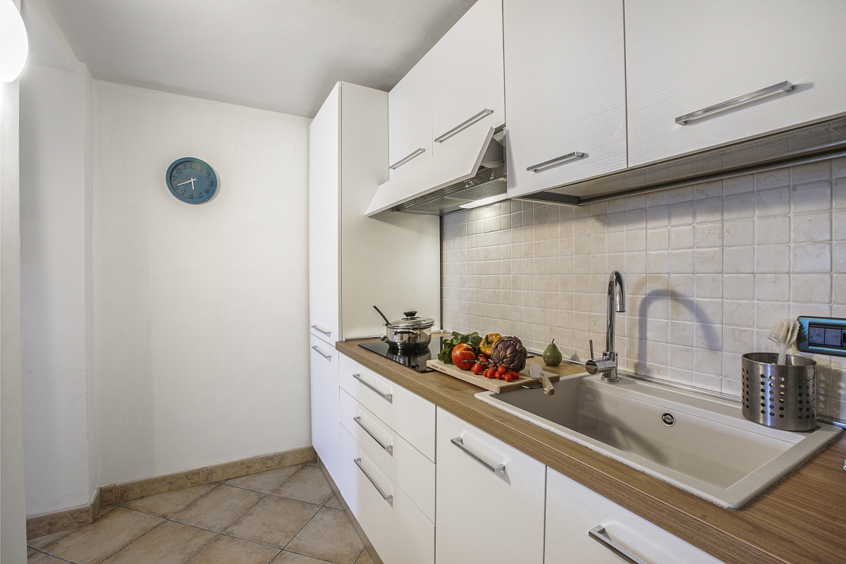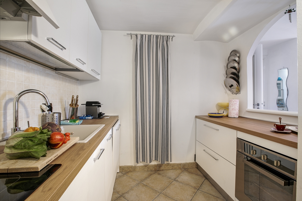 French windows from the garden lead directly into the open-plan living space which is tastefully decorated with a sofa, flat-screen TV and a circular dining table for 6. The kitchen is separate but there is an attractive arched hatch opening onto the dining area to allow easy serving. The kitchen is equipped with an induction hob, microwave, dishwasher, fridge and a Nespresso coffee machine.