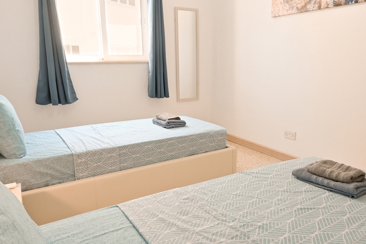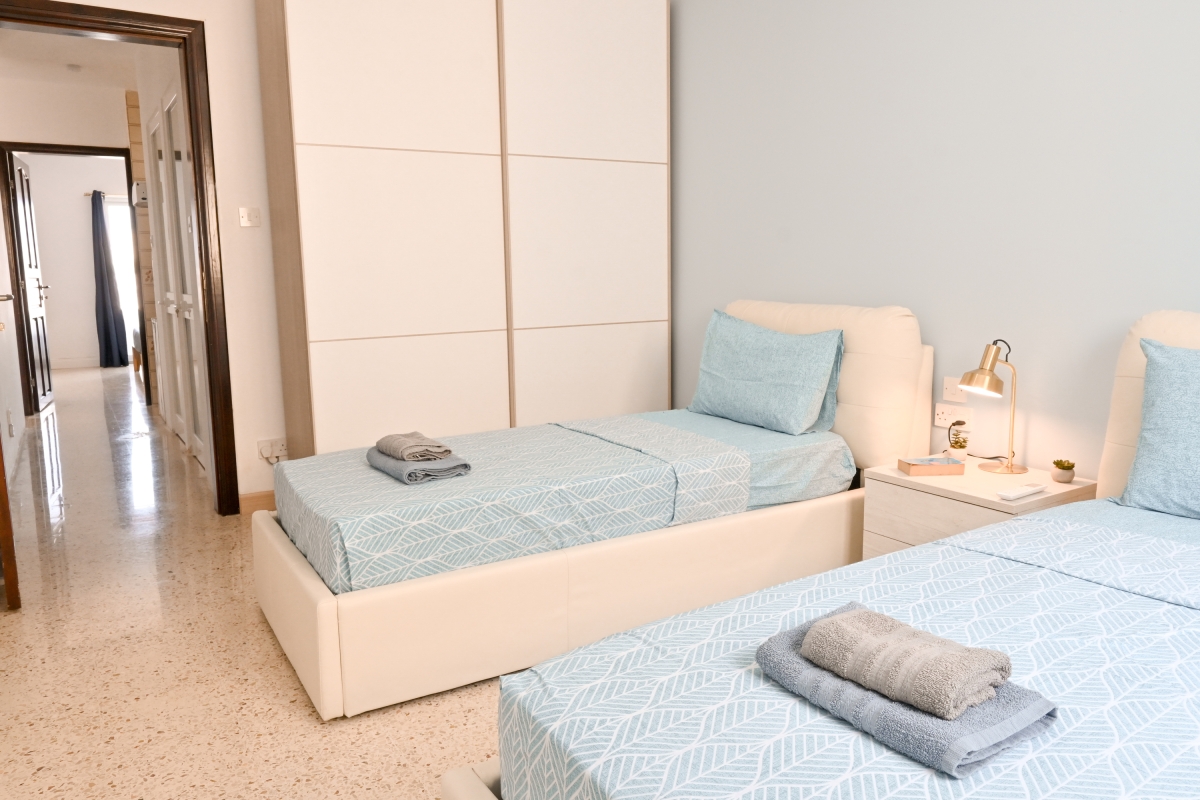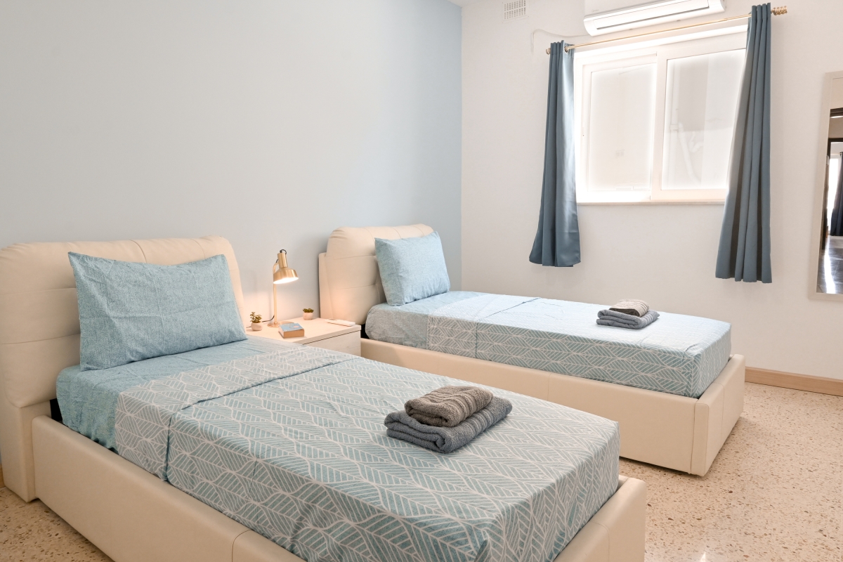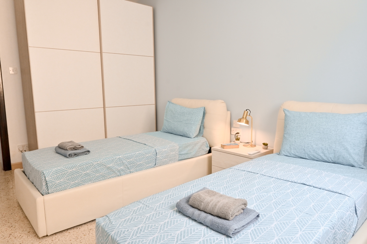 Bedroom 2: The second air-conditioned bedroom is furnished with two single beds and a wardrobe.