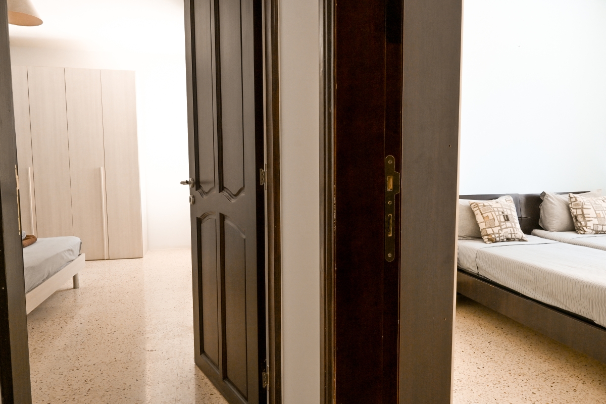 Bedroom 1: The first air-conditioned ensuite bedroom is furnished with a double bed, a balcony and a wardrobe.