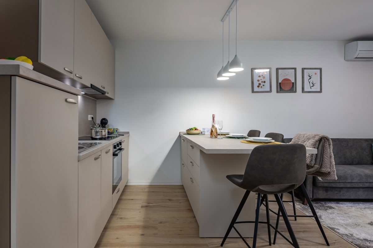The living area is furnished with contemporary pieces, including a sofa, coffee table and flat-screen TV. The kitchen is separated from the seating area by a breakfast bar for casual dining. The modern kitchen is equipped with an induction hob, oven, dishwasher, fridge, freezer and kettle.