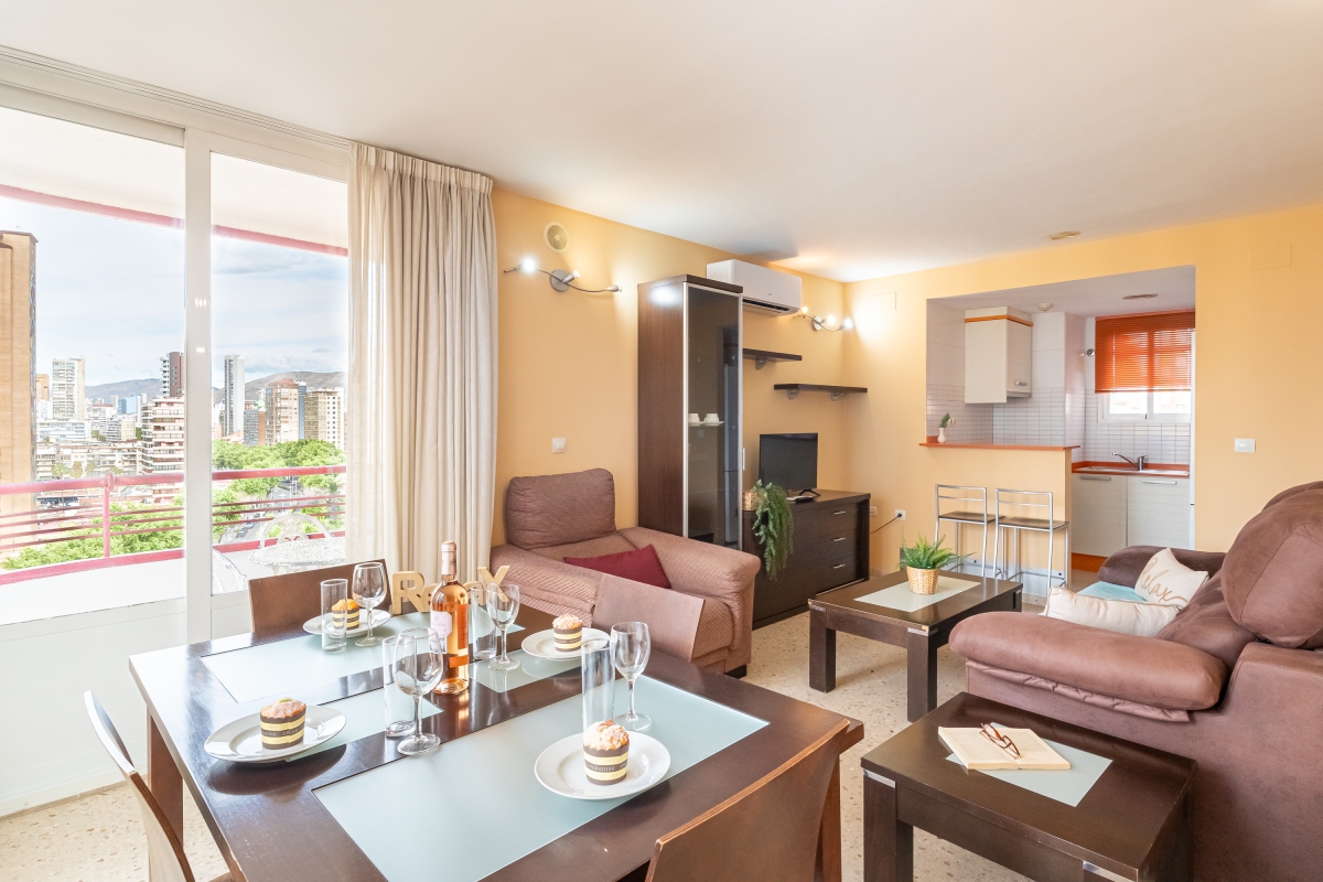 Benidorm Levante Beach is a modern and stylish 8th-floor apartment with a lift-elevator, perfectly located just meters from the golden sands of Benidorm’s famous Levante Beach. Accommodating up to 4 guests with 1 cosy bedroom and 1 well-appointed bathroom, this apartment is ideal for small families and groups. Inside, the apartment features a bright and airy living room furnished with a comfortable double sofa, offering access to a lovely terrace with good views. The open kitchen is fully equipped with essential appliances, including a coffee machine, electric kettle, microwave, oven, toaster, fridge, and induction hob, ensuring you have everything you need for meal preparation.
