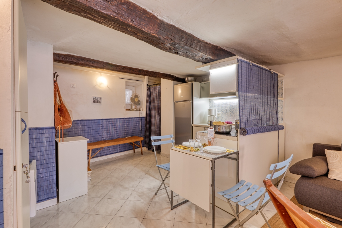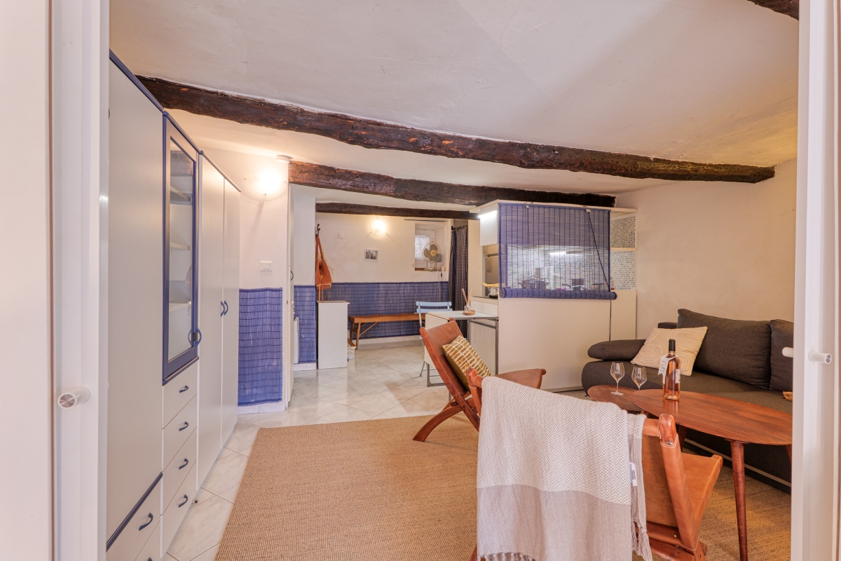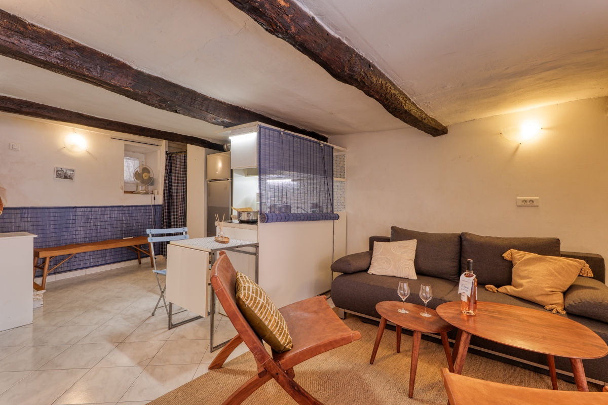 Tucked within the charming alleyways of Menton’s historic centre, this apartment offers a cosy retreat just steps from the beach, markets, restaurants, and cultural sites. Perfectly suited for up to four guests, this ground-floor apartment blends traditional character with modern convenience. The open-plan living space welcomes you with warm wooden beams, soft lighting, and tasteful décor that evokes a homely and peaceful atmosphere. Large windows fill the space with natural light and offer lovely rooftop views that add to the apartment’s charm.