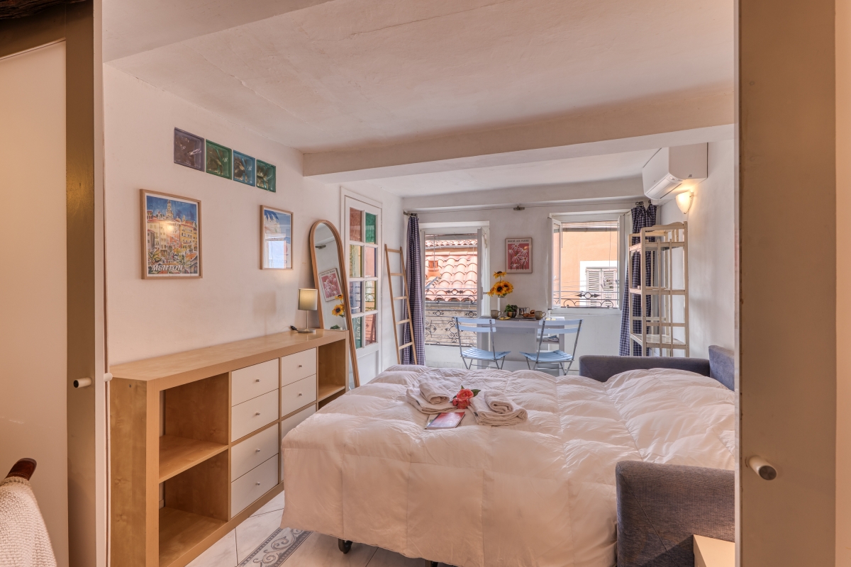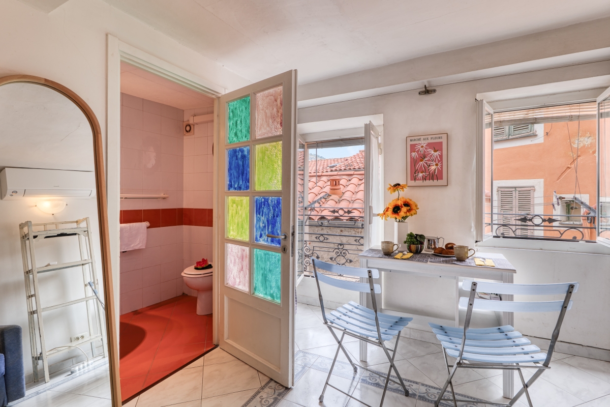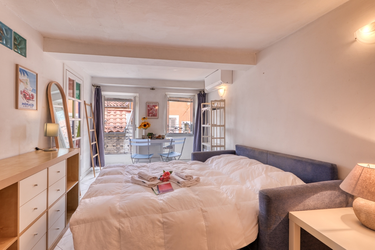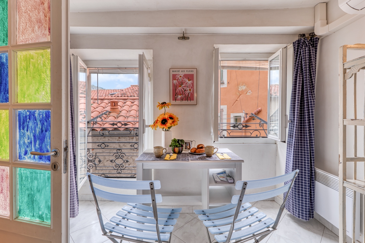 Tucked within the charming alleyways of Menton’s historic centre, this apartment offers a cosy retreat just steps from the beach, markets, restaurants, and cultural sites. Perfectly suited for up to four guests, this ground-floor apartment blends traditional character with modern convenience. The open-plan living space welcomes you with warm wooden beams, soft lighting, and tasteful décor that evokes a homely and peaceful atmosphere. Large windows fill the space with natural light and offer lovely rooftop views that add to the apartment’s charm.