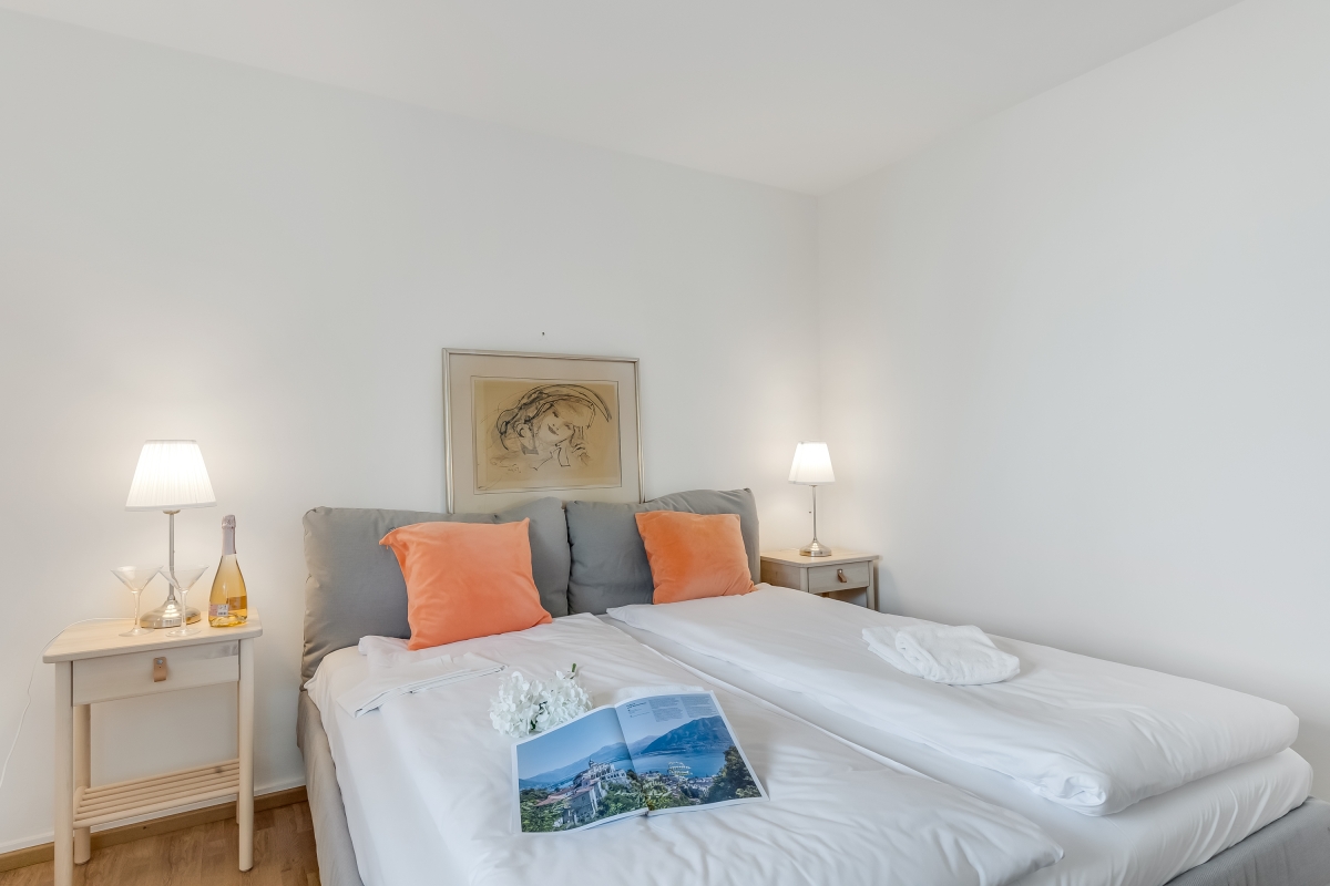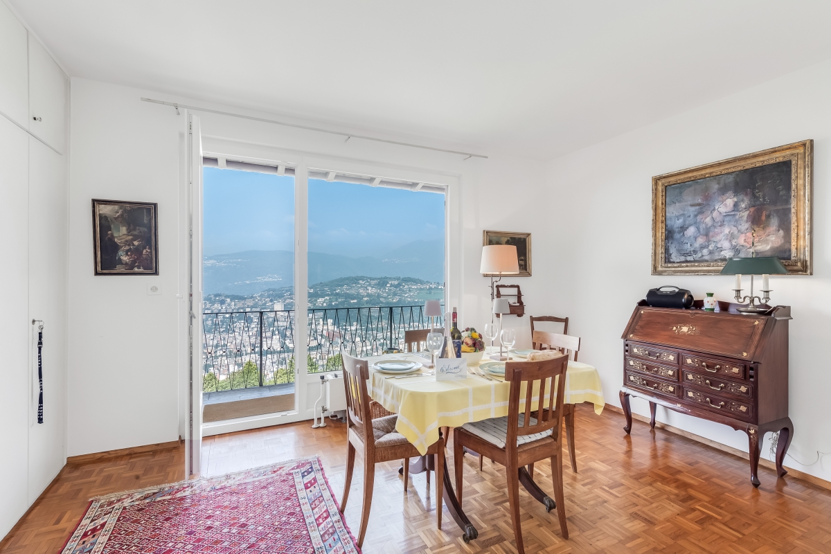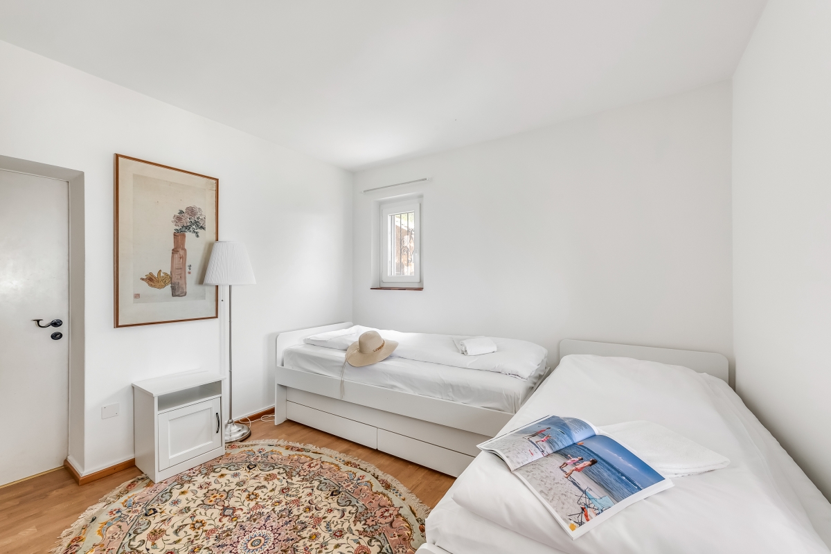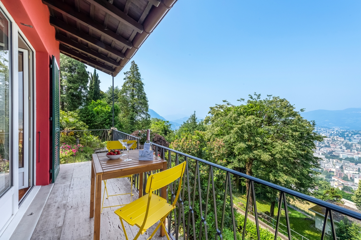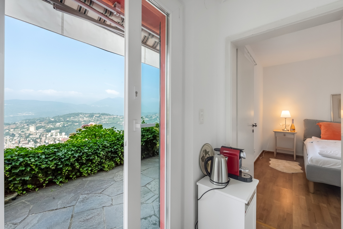 Nestled on a sunny hillside overlooking Lugano, the property is arranged over two floors connected only by an external staircase. Guests will need to climb 19 steps to reach the entrance to the ground floor, where two bedrooms are located, and an additional 17 steps to reach the 1st floor.