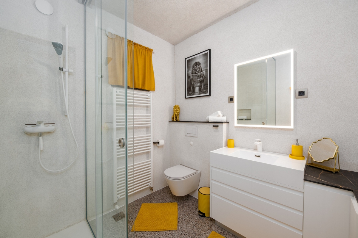 The independent, modern bathroom is equipped with a shower, basin and WC.