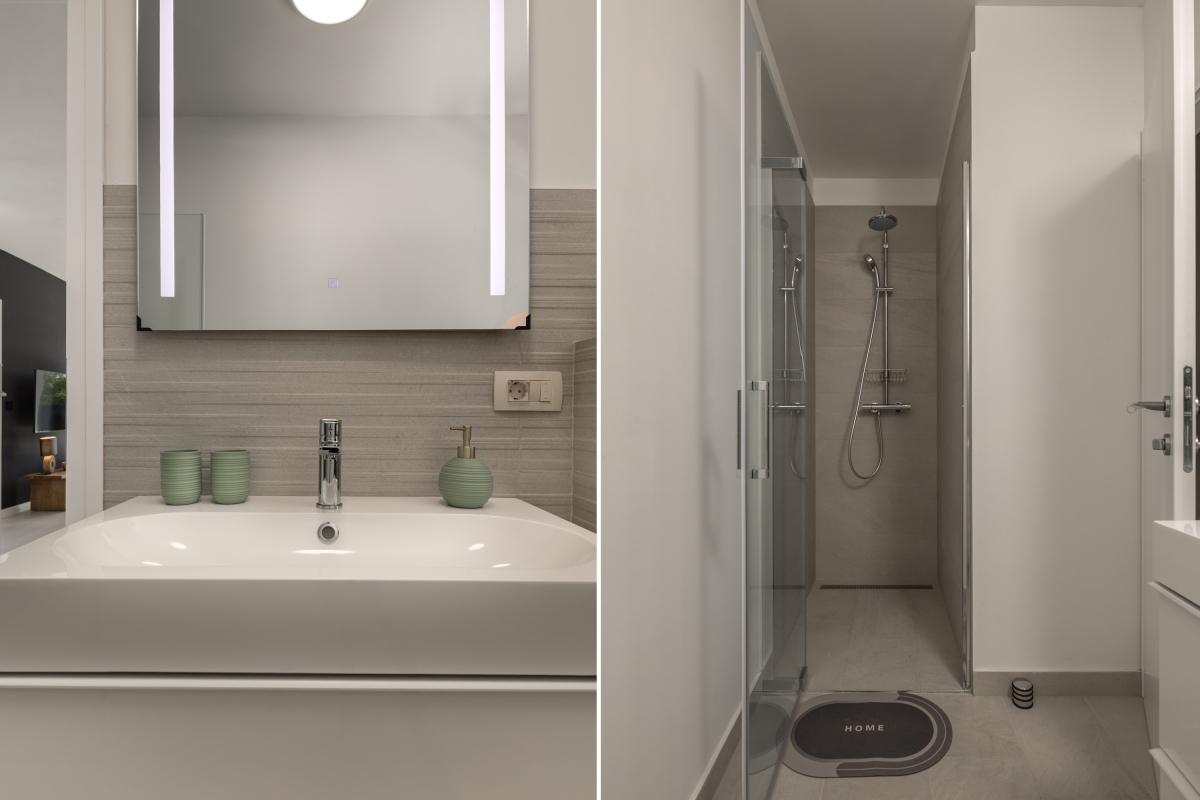 The elegant modern bathroom is equipped with a walk-in shower, basin and WC.