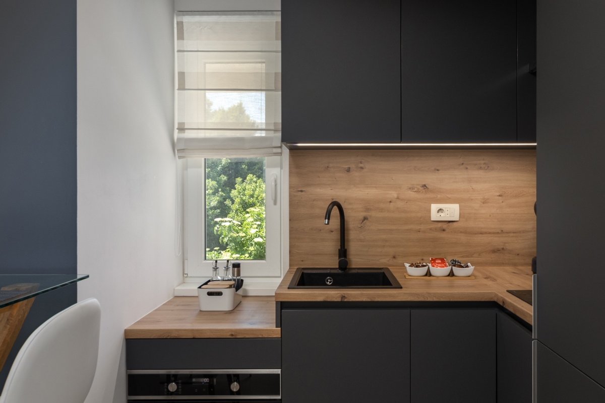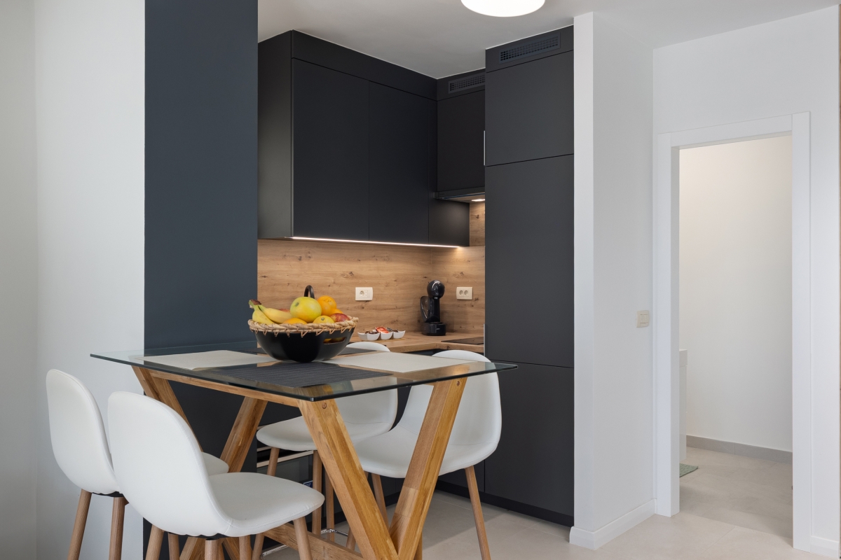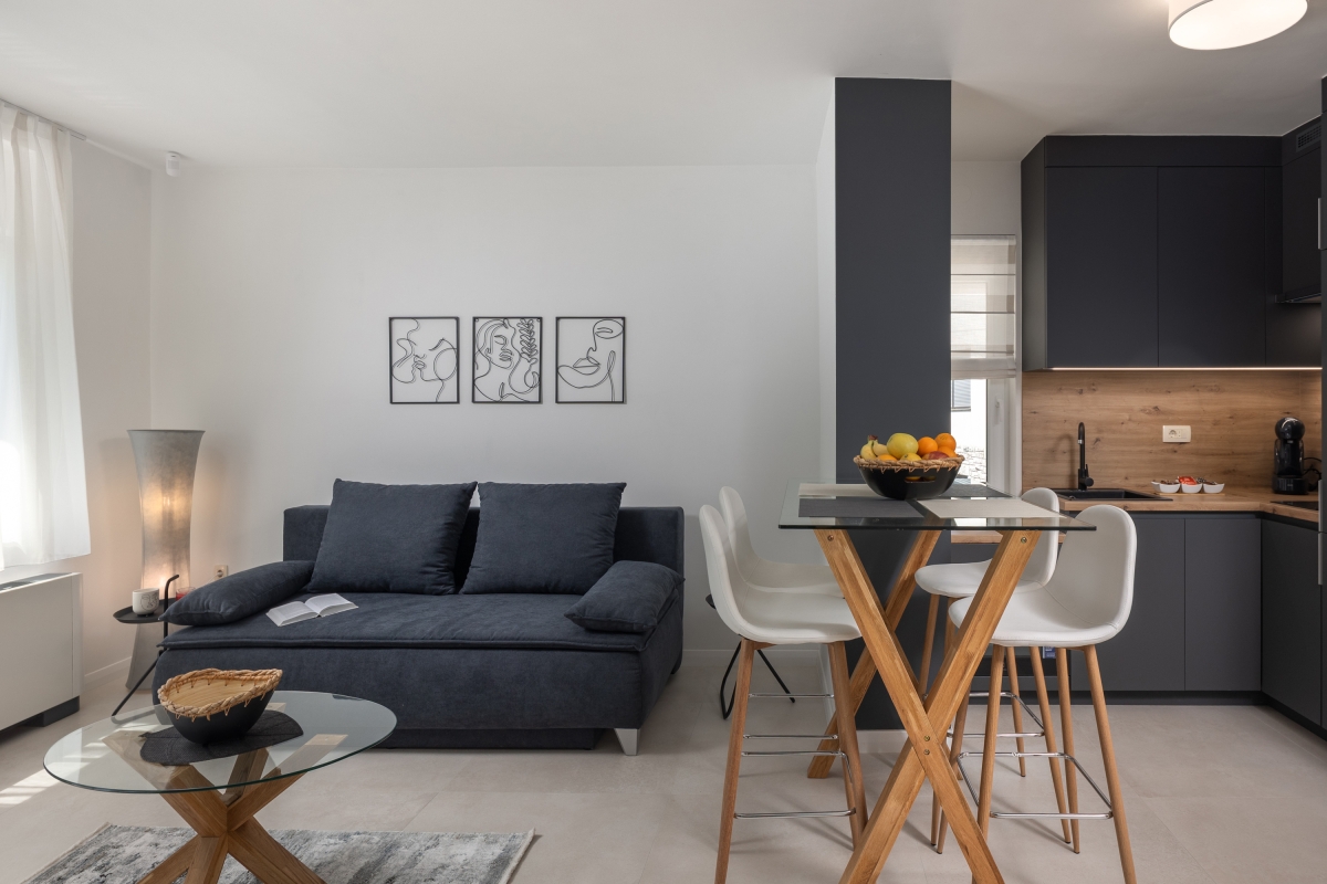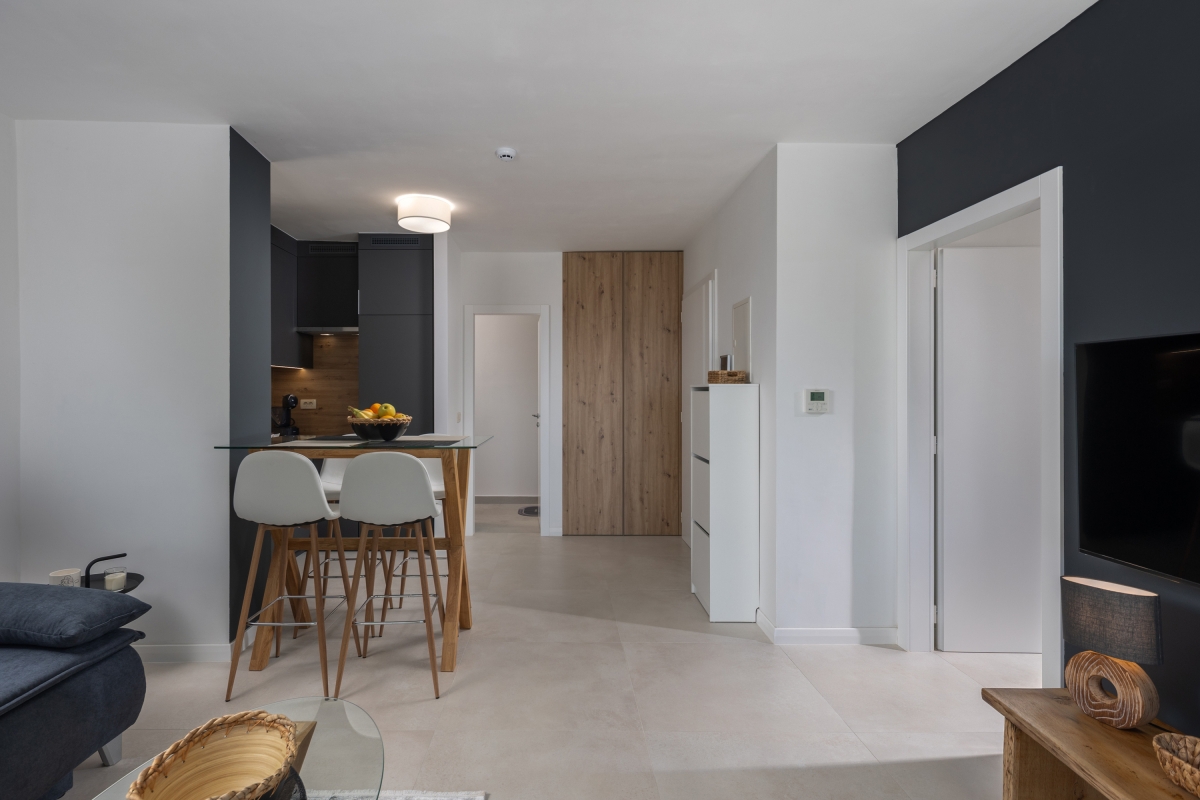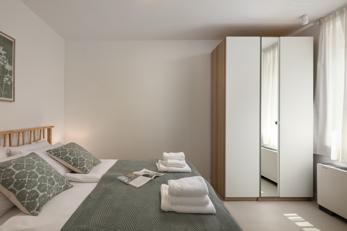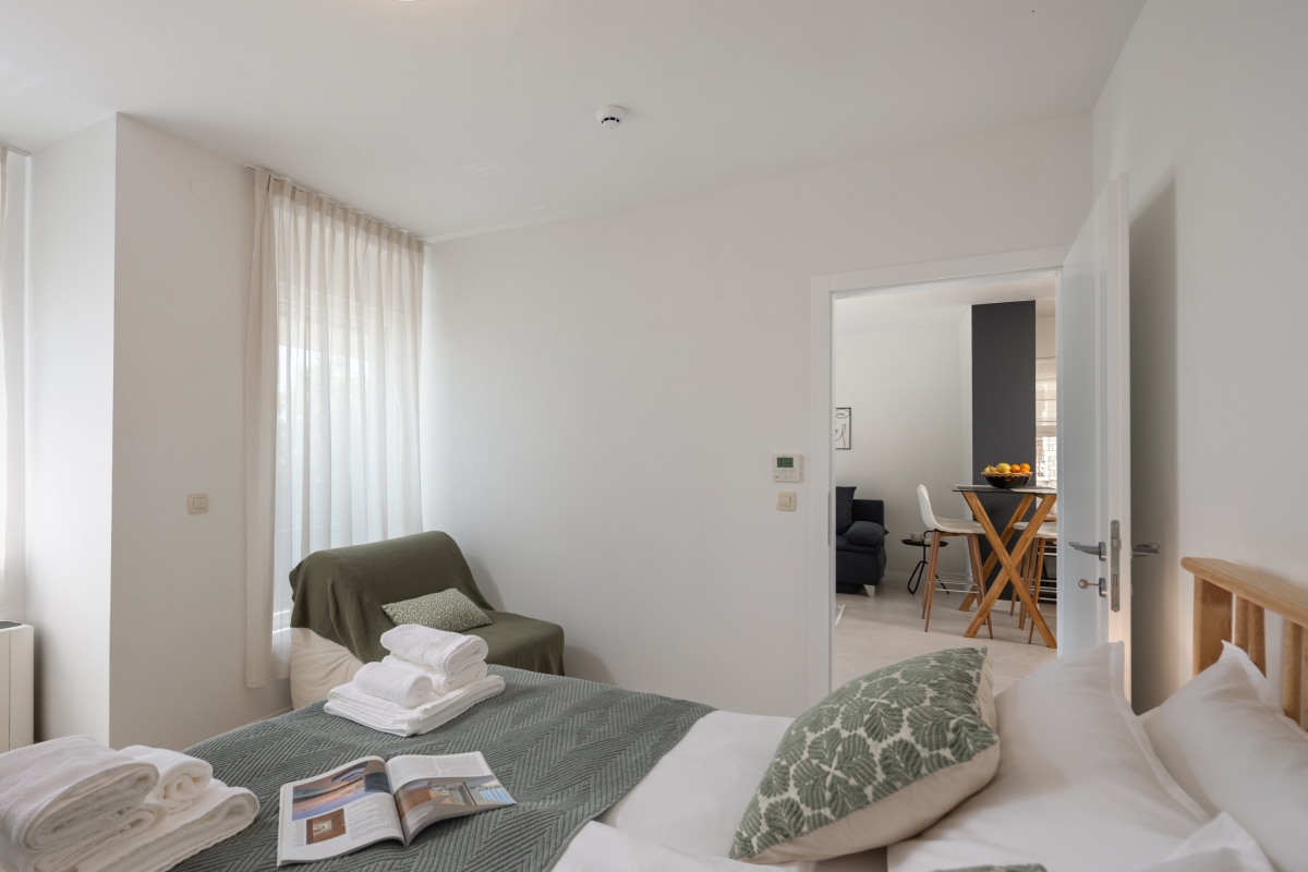 The apartment has been tastefully furnished to ensure that guests have a comfortable stay. The open-plan living space is full of light, thanks to glass doors that open out onto a spacious balcony. Here guests can enjoy a glass of local wine, in quiet surroundings.