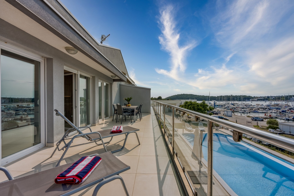 The open-plan living area is full of light, with glass doors on two sides. These open onto a private balcony. From here, guests can look out over the shared swimming pool to the lively marina at Volme. The balcony is furnished with sun loungers.
