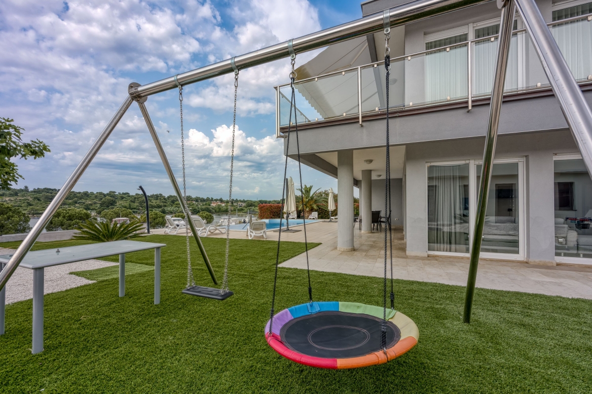 The shared swimming pool is surrounded by sun loungers where guests can relax after a refreshing dip. There are also some swings where children can play.