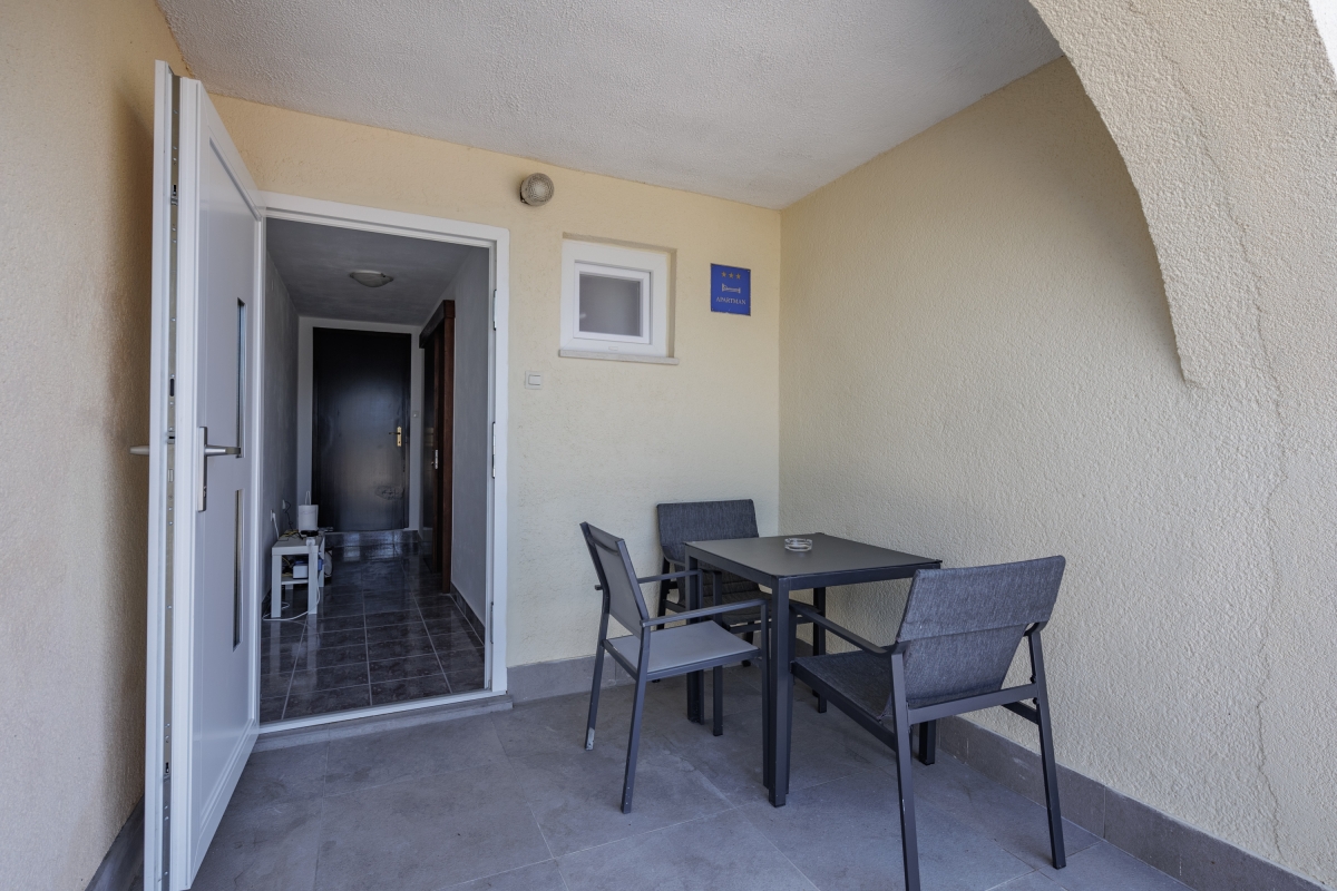 This first-floor apartment accommodates up to four guests. It offers a tranquil retreat with a sunny disposition, perfect for families or couples seeking a relaxing getaway. The living area is designed for comfort, boasting a double sofa, a wardrobe, and air conditioning. The well-equipped kitchen with a coffee machine, electric kettle, microwave, toaster, full kitchen setup, fridge, and induction hob.