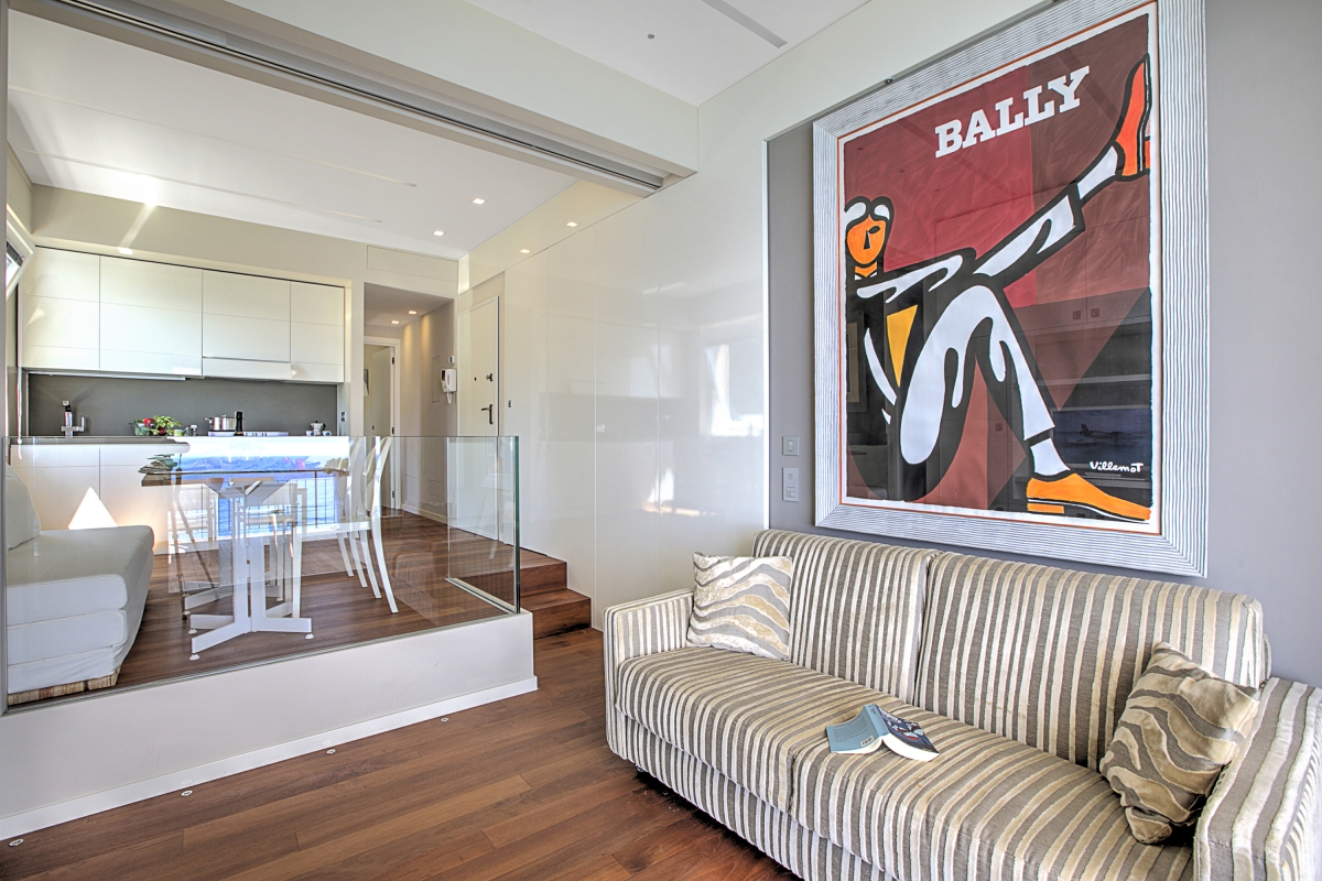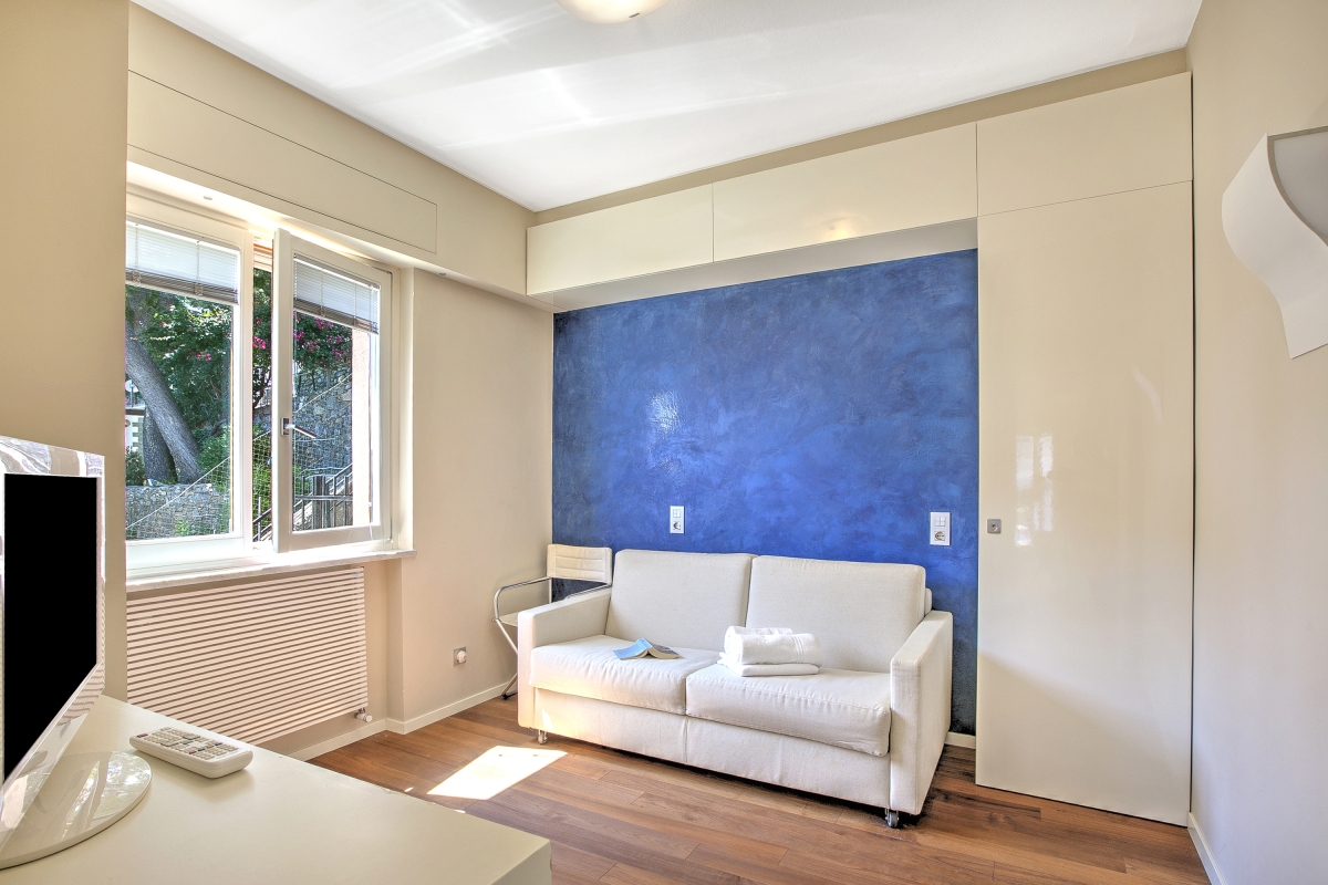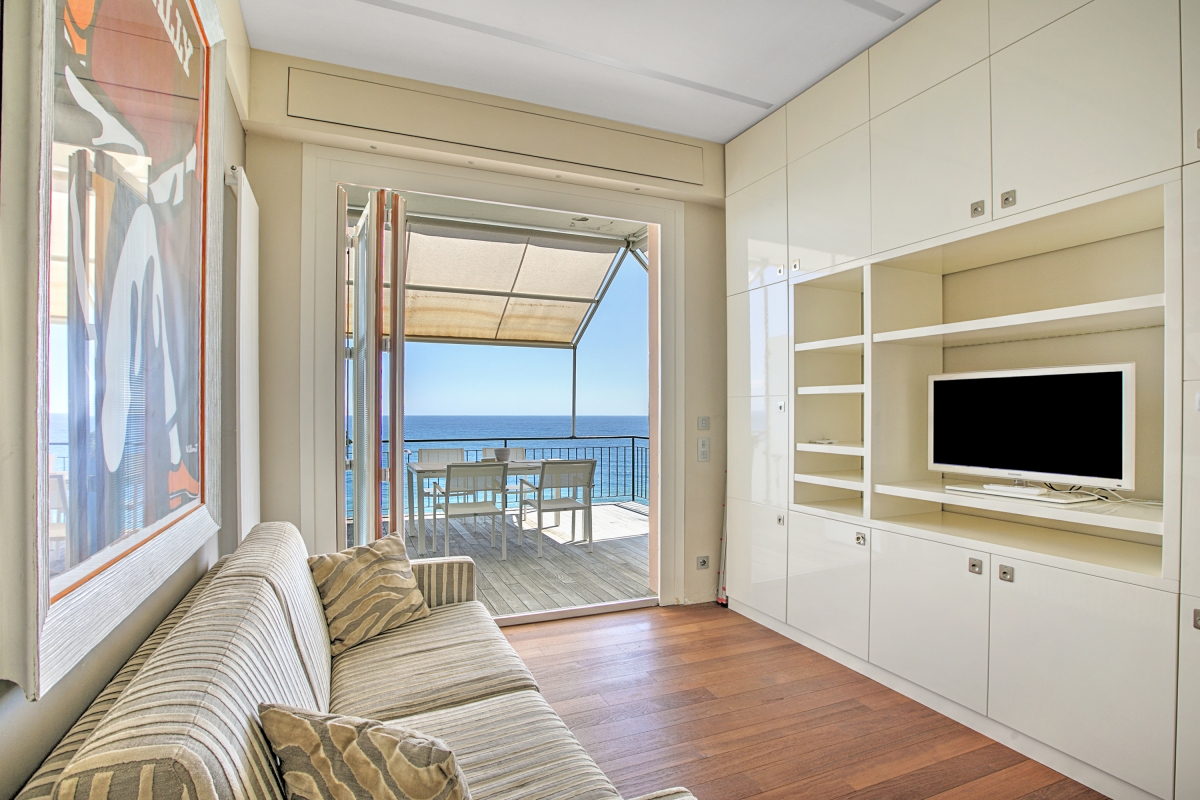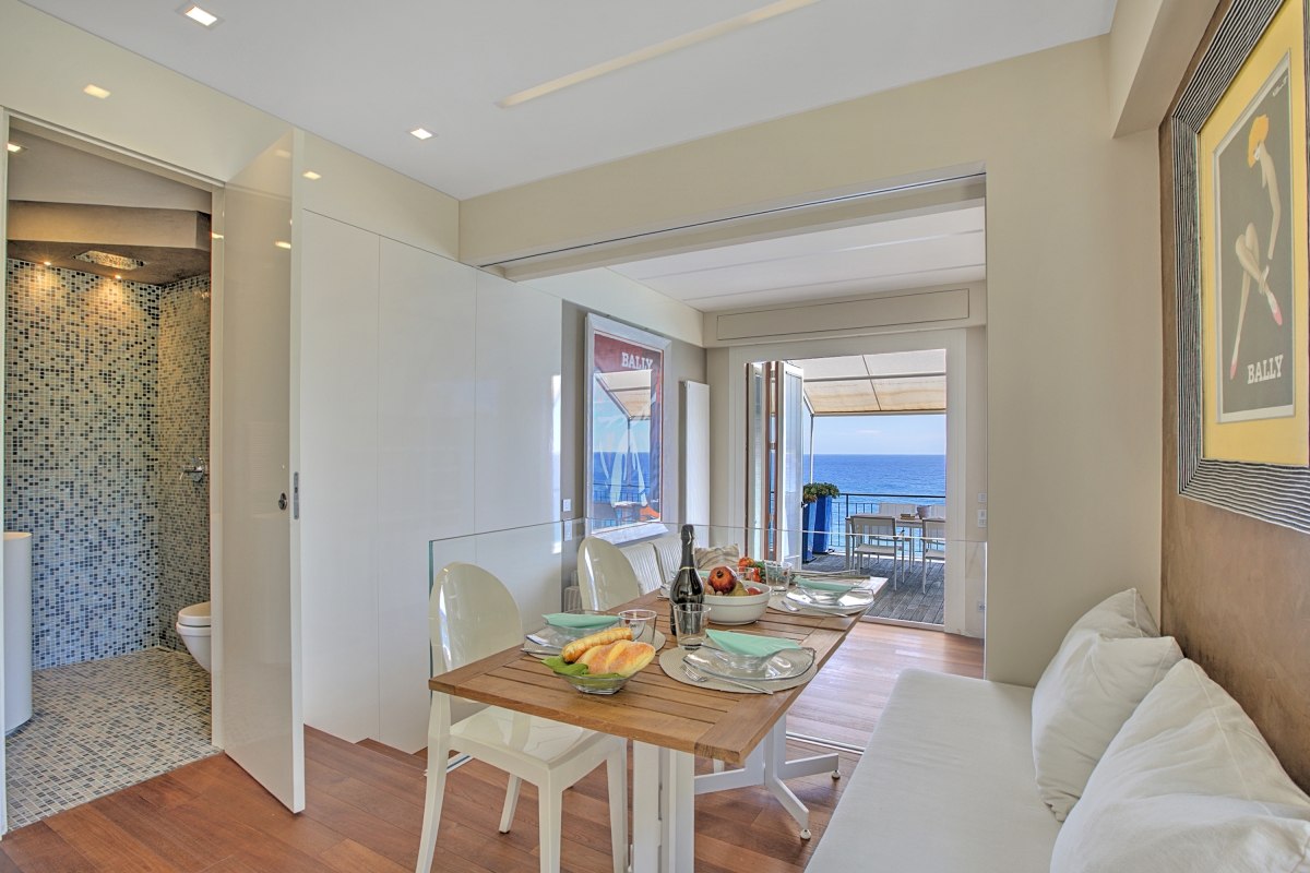 The apartment consists of an open-plan living room with glass doors leading out onto a private balcony. The shaded balcony offers panoramic views of the Mediterranean and makes a wonderful dining room for meals al fresco. Back indoors, there is a stylish sofa, with a flat-screen TV. The raised dining area includes a table that seats 4 people and a sleek kitchenette. The kitchenette is equipped with a cooker hob, dishwasher, fridge/freezer and a Moka coffee maker.