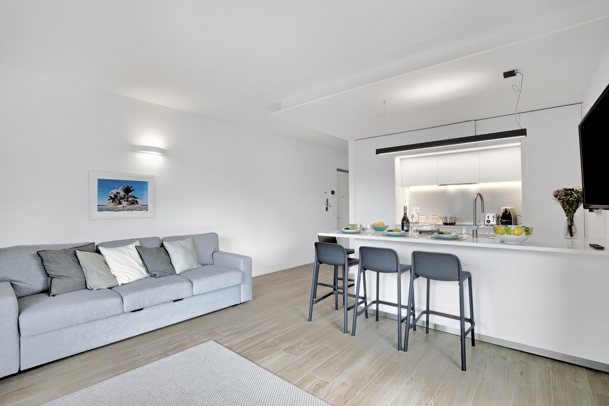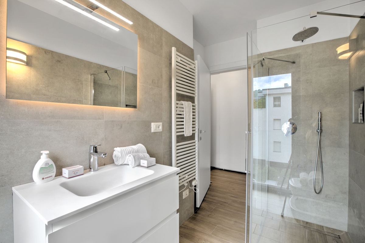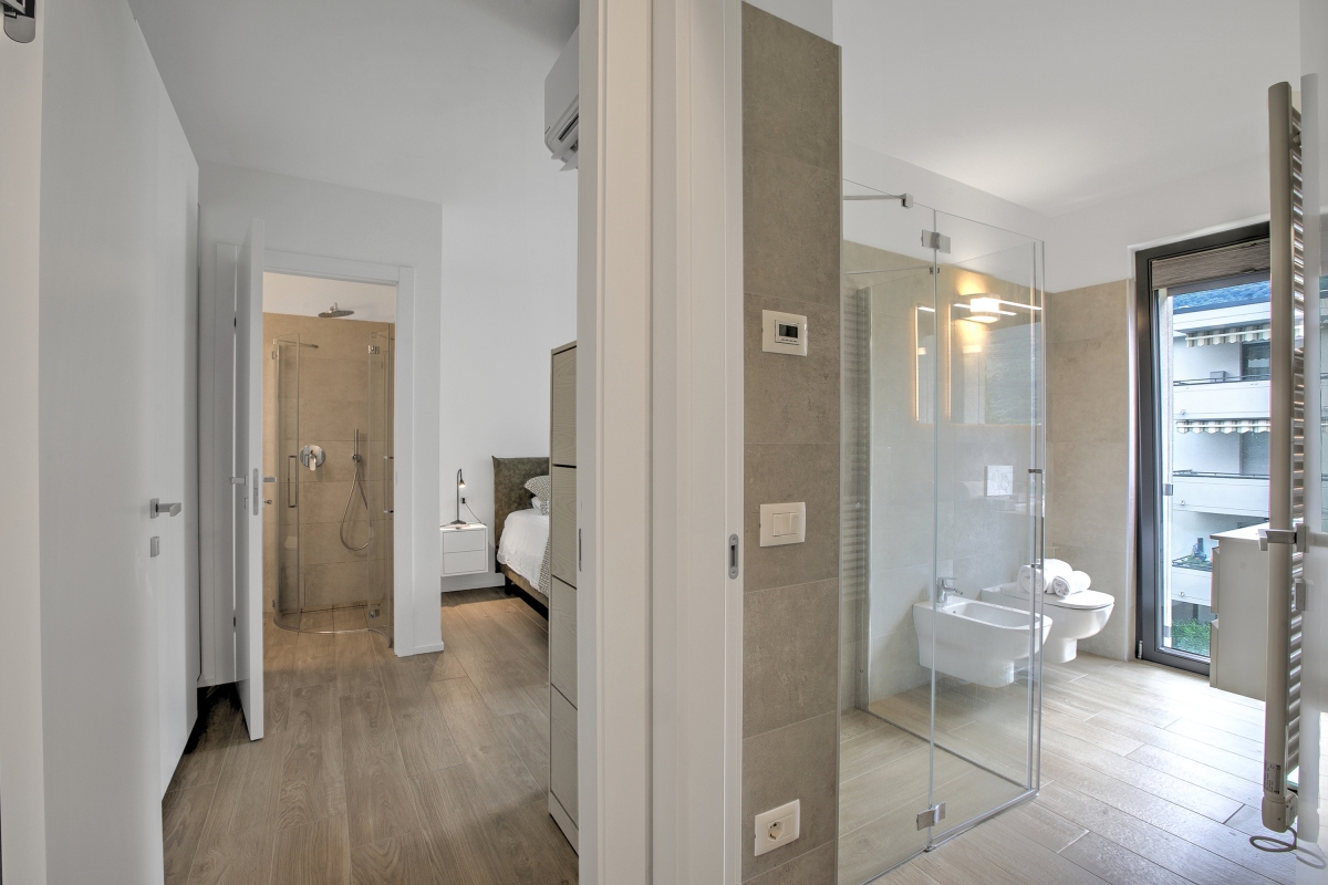 This is a serene retreat located on the 2nd floor of a modern residence with a lift-elevator, making it perfectly accessible for families with children or elderly guests. This beautifully furnished two-bedroom apartment accommodates up to four guests and offers a peaceful stay amidst natural beauty. The spacious living room is elegantly designed with plush sofas and a flat-screen TV, creating a welcoming space to unwind. Large glass doors flood the room with sunlight and lead out to a private terrace set with an outdoor dining table and chairs—perfect for enjoying meals against the stunning backdrop of the lake and surrounding mountains.