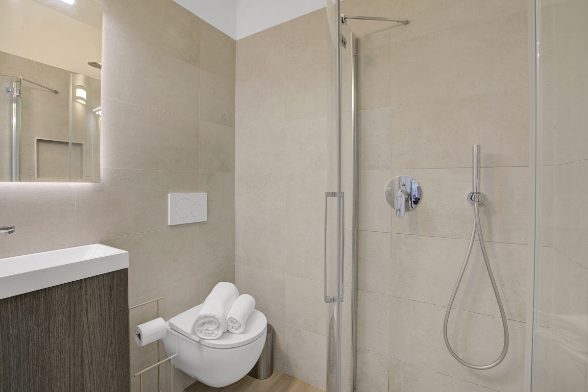 Bathroom 2: This bathroom features a shower, a wash basin, and a WC.