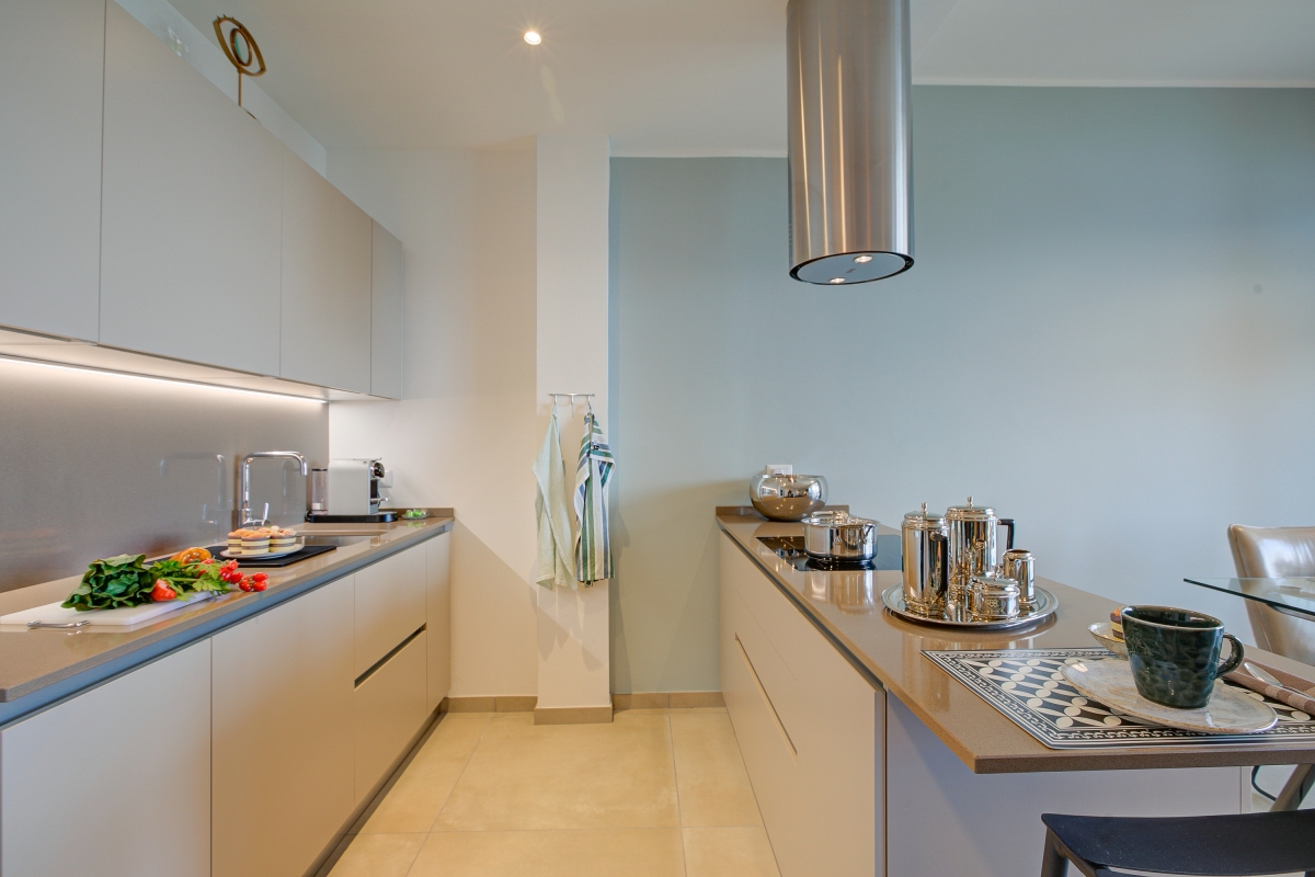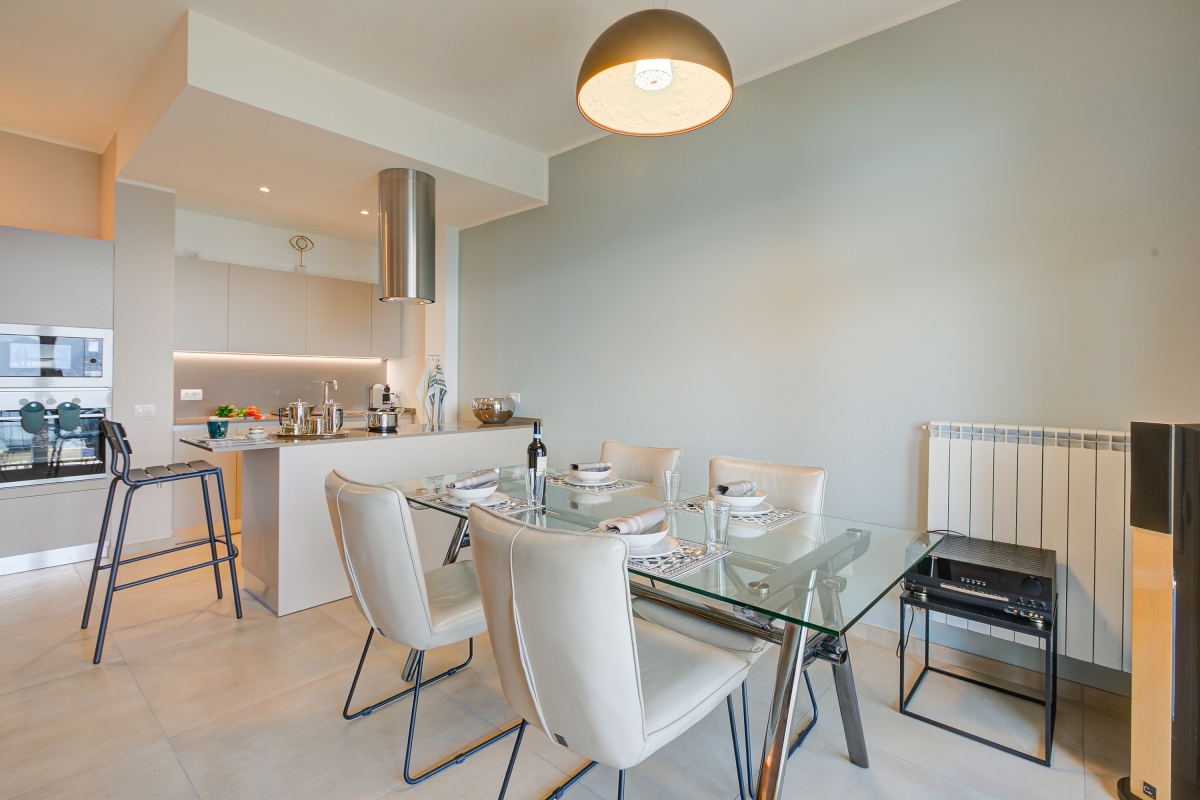 Back indoors, the seating area includes a sofa and a flat-screen TV. Next to this is the dining table that seats 4 people. The kitchen is separated from the dining area by a convenient breakfast bar. The sleek, modern kitchen is well-equipped with a cooker hob, oven, microwave, dishwasher, fridge, freezer and a Nespresso coffee machine.