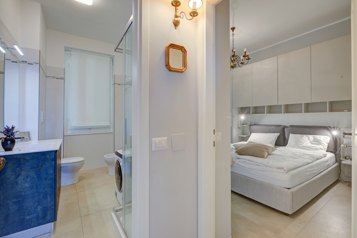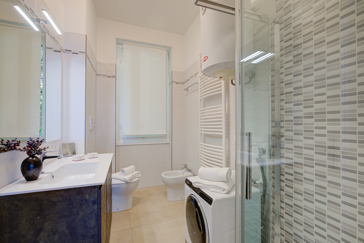 The modern bathroom is equipped with a shower, bidet, basin, washing machine and WC.
