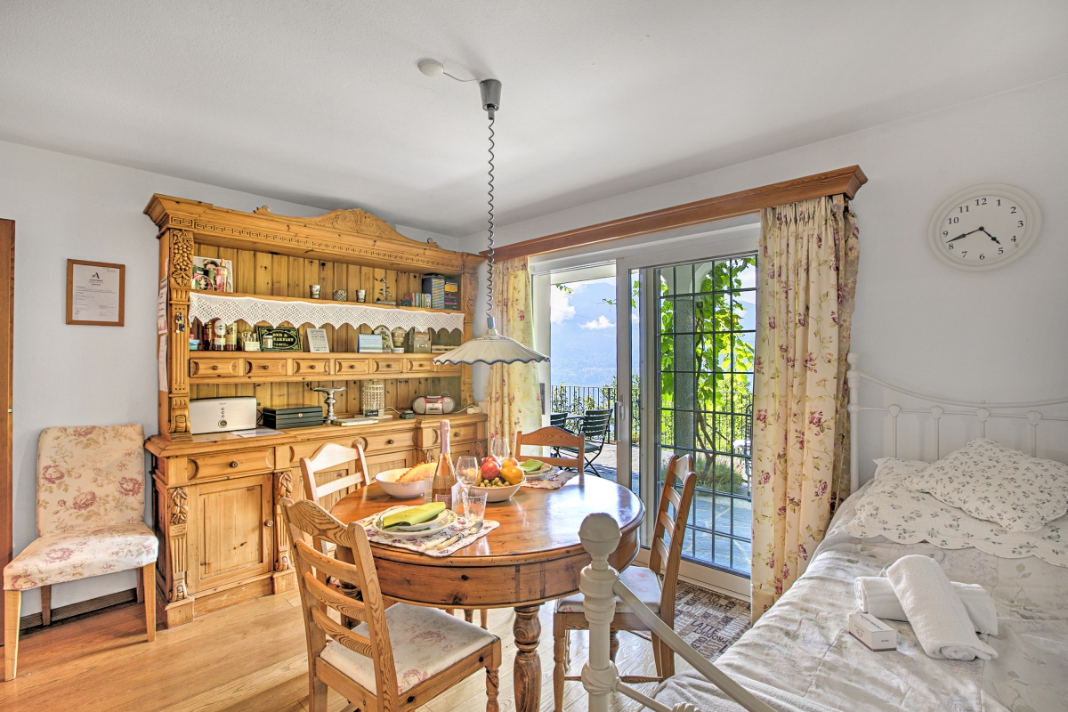 The cozy double bedroom, with its genuine hardwood floors, rustic brick details, and beautifully crafted wooden walls and furniture, is especially warm and intimate. Every corner exudes comfort and charm. Stepping onto the lovingly tended terrace with its dining table and chairs, you'll be immersed in the gentle rhythm of nature, listening to the soft murmur of the stream, observing the blossoming and fading of plants with the changing seasons, and enjoying meals amidst vibrant greenery and cheerful birdsong. The breathtaking view of the lake can be admired from every room, making the landscape a constant companion throughout your stay.