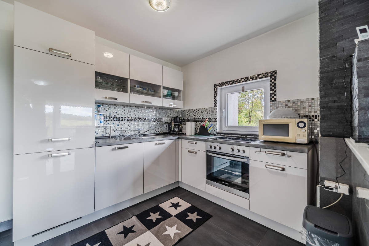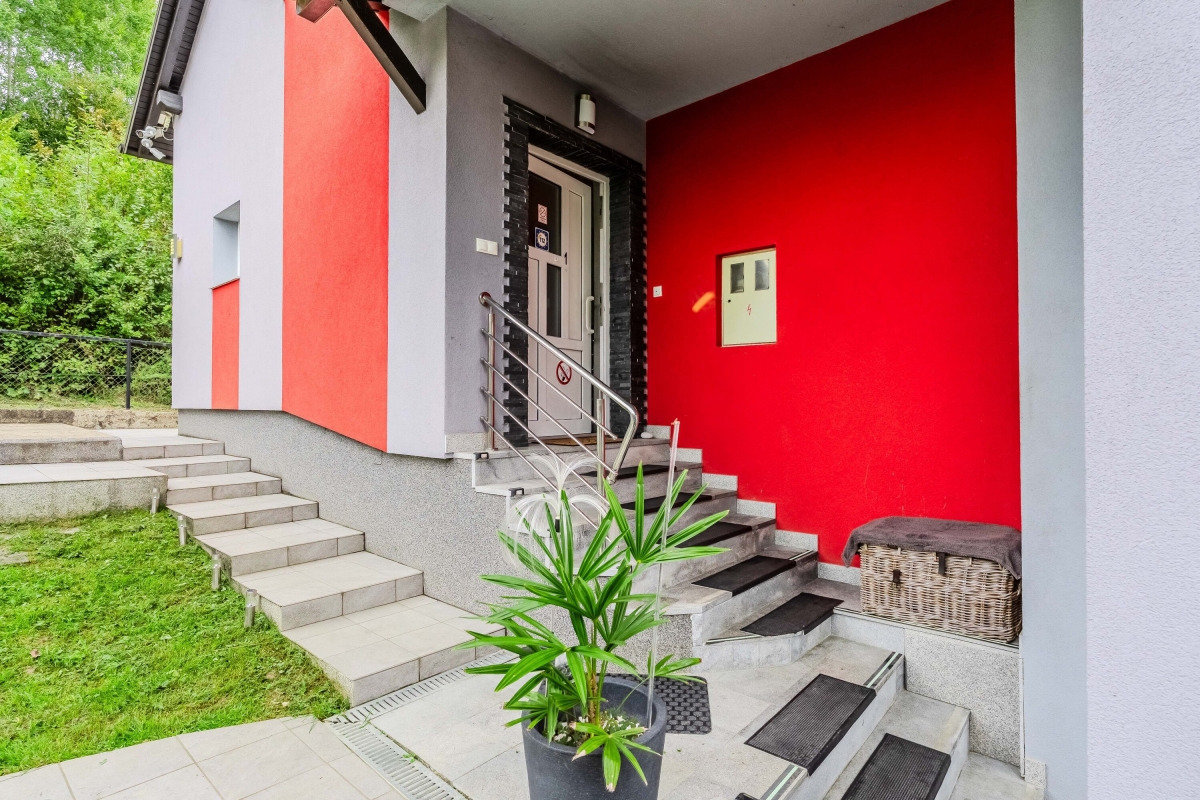 This is a delightful hillside retreat set just above the crystal-clear waters of the Dobra River. Spread across the first and second floors, this charming holiday home perfectly combines nature, comfort, and fun, making it ideal for families, friends, or couples. The house accommodates up to six guests, offering two spacious bedrooms and a beautifully furnished living room, complete with a laptop-friendly workspace for those who wish to blend work with leisure. The interiors are exquisitely designed, bringing together luxury and coziness, while the dining area offers lovely views of the surrounding landscape. A modern open-plan kitchen, fully equipped with a cooker hob, electric kettle, coffee machine, oven, toaster, dishwasher, microwave, and fridge with freezer, ensures all the essentials for a carefree stay.