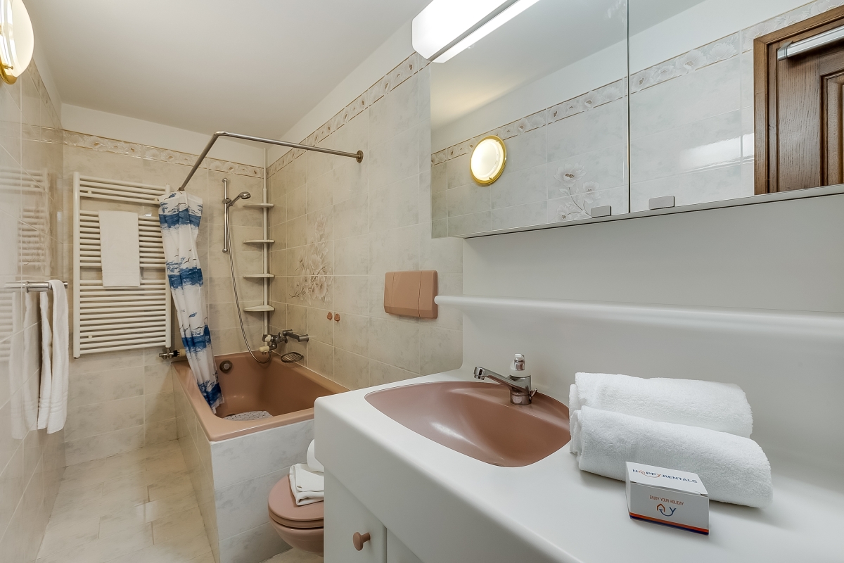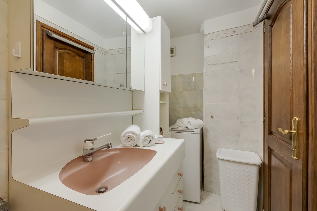 Passing by, you will find yourself in the bedroom with a double bed and wooden wardrobe and access to the bathroom with bathtub and washing machine.